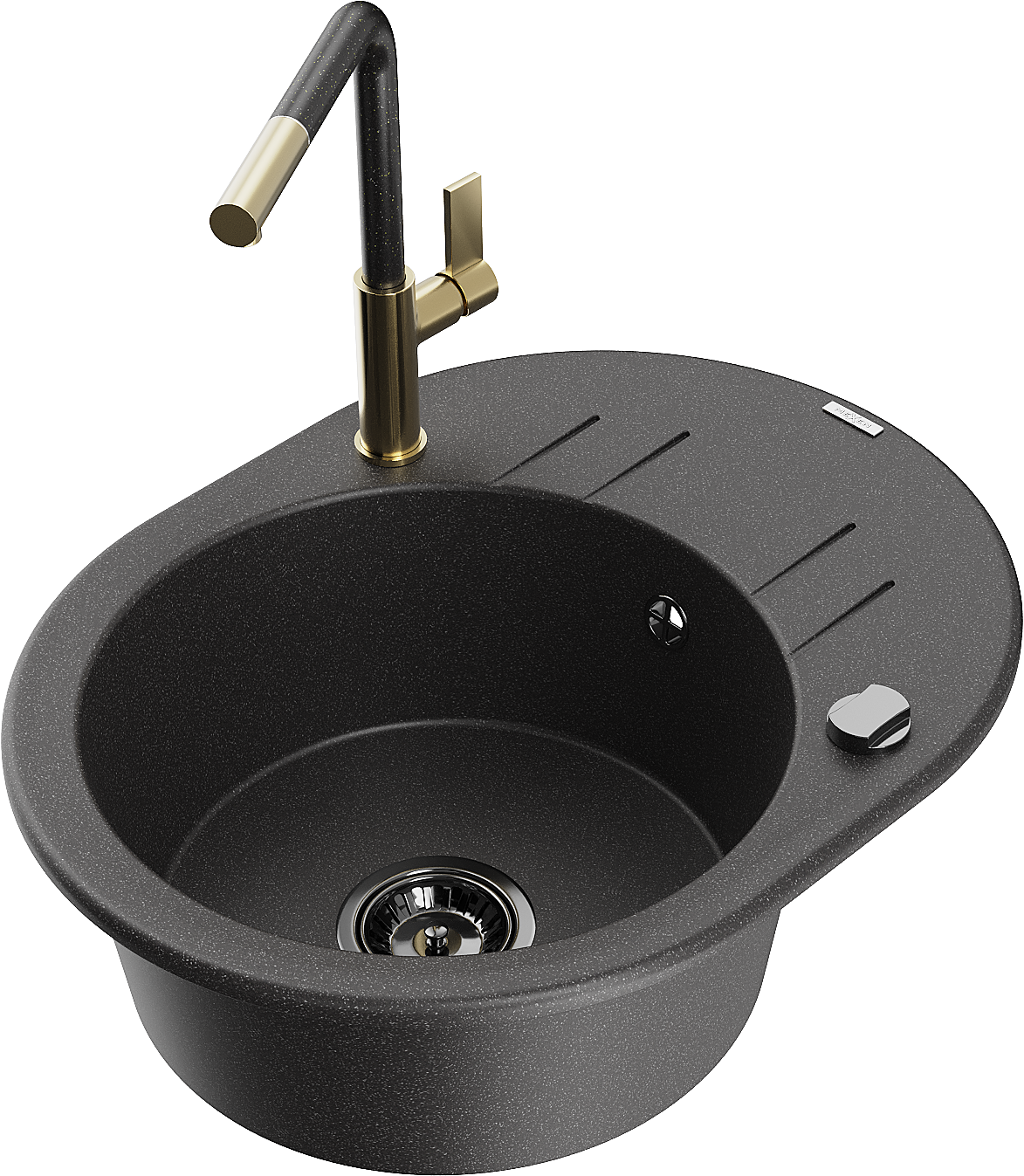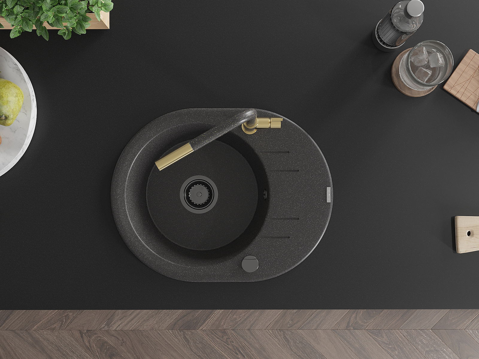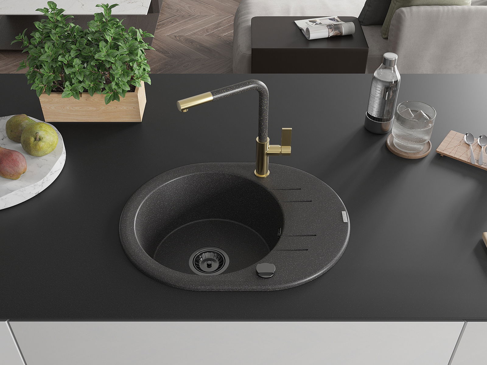 Mexen Kevin vienos dalies granitinė kriauklė su nusausintuvu ir Flora virtuviniu maišytuvu, juoda su taškeliais