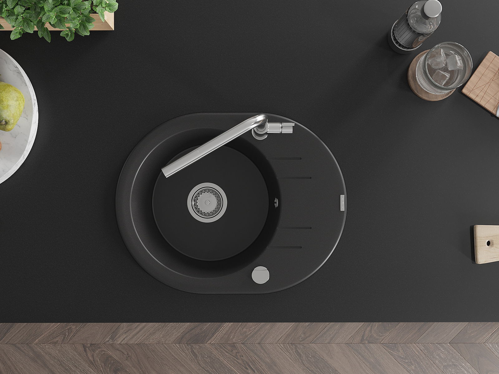 Mexen Kevin granitinis vienos sekcijos plautuvė su laikikliu ir virtuviniu maišytuvu Flora, juoda - 6517-77-670401-00