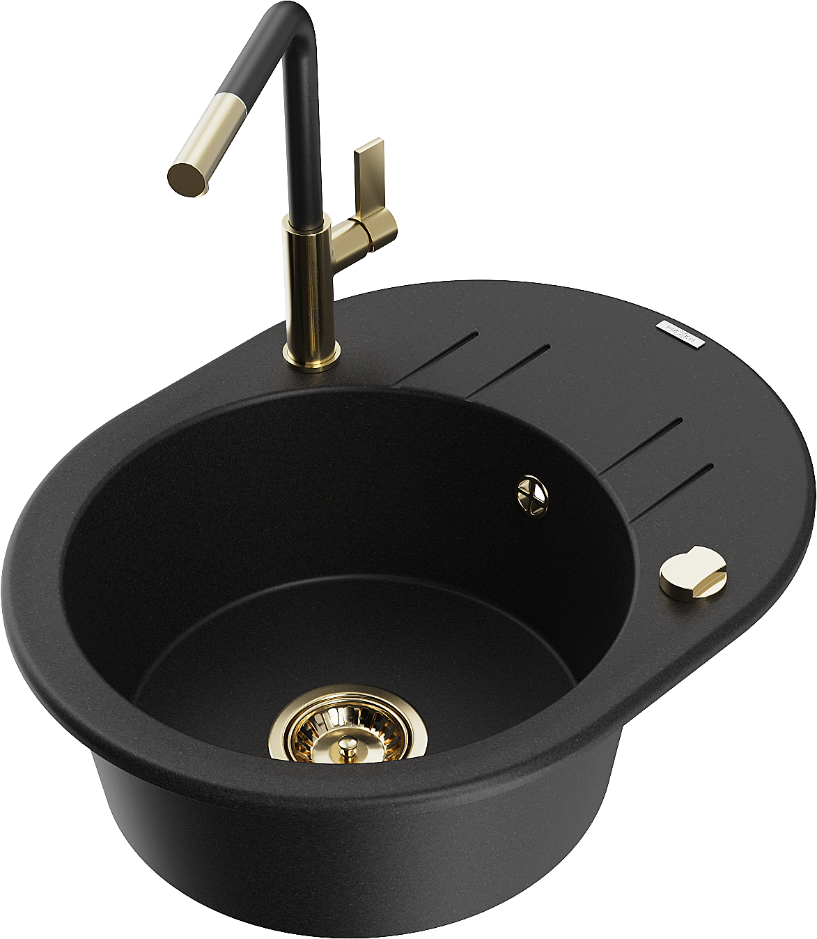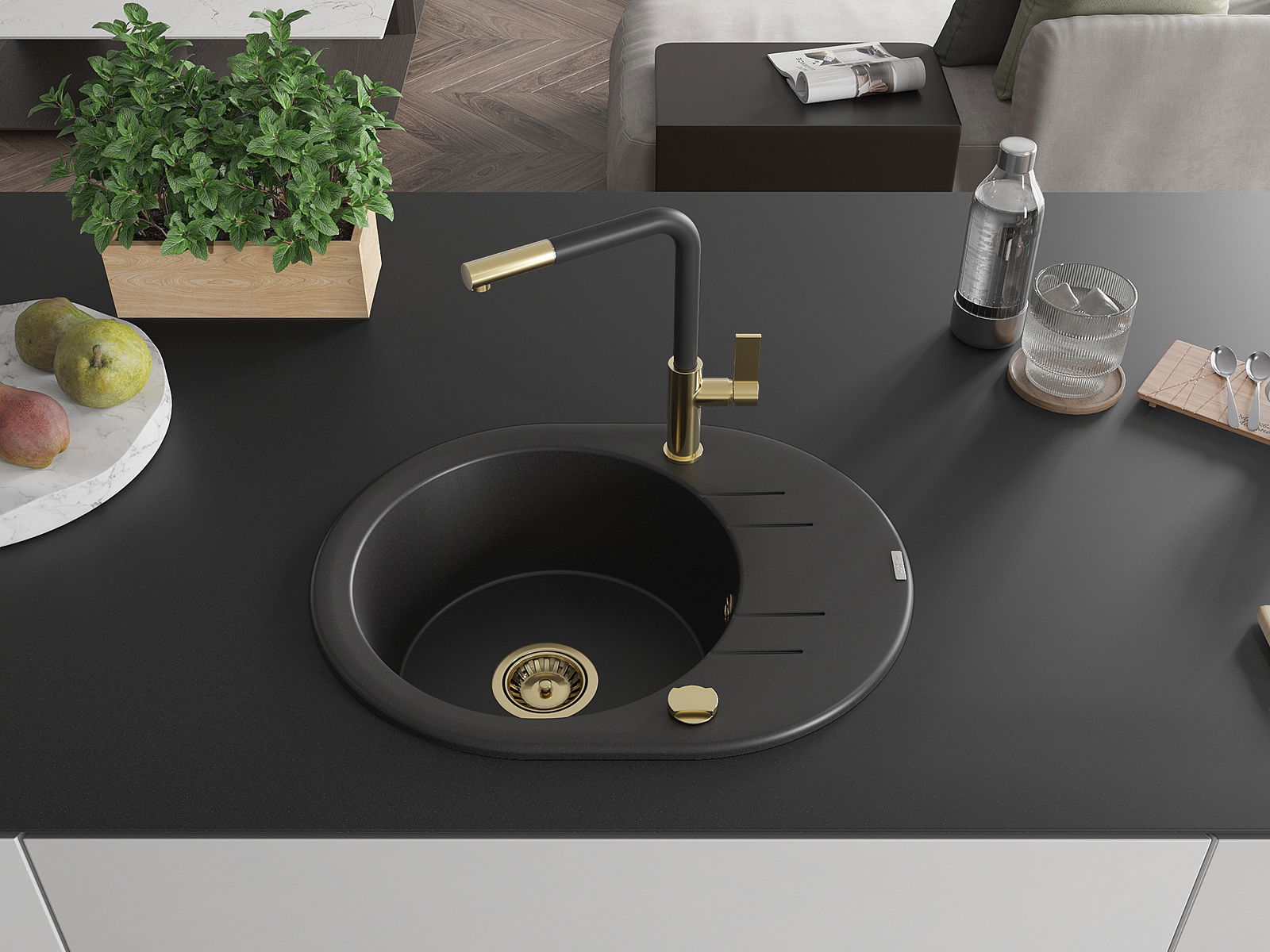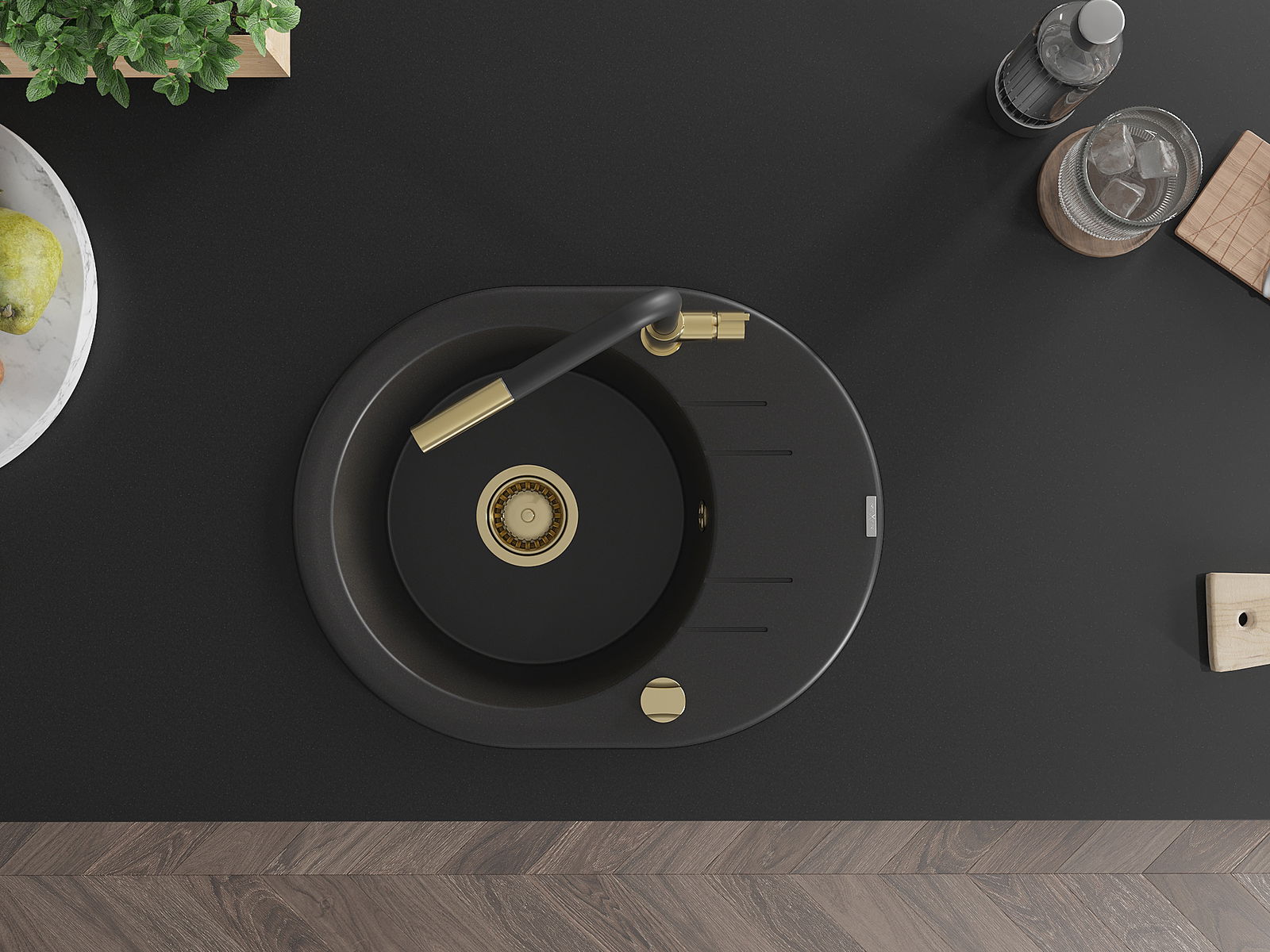 Mexen Kevin granito plautuvė vienos kriauklės su nutekamu ir virtuviniu maišytuvu Flora, juoda - 6517-77-670401-57-G