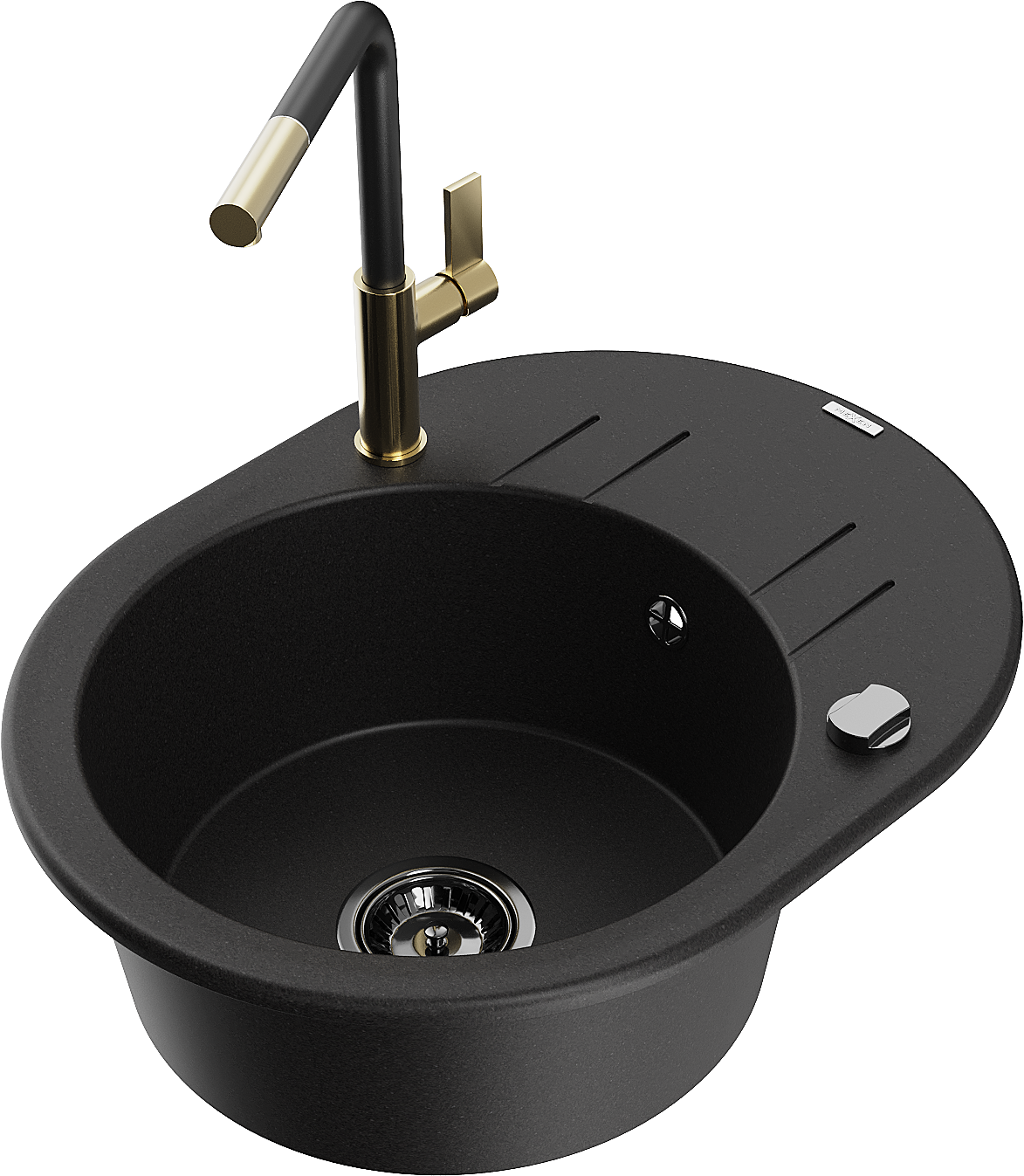 Mexen Kevin granitinė vienos kameros plautuvė su nutekamu ir virtuvės maišytuvu Flora, juoda - 6517-77-670401-57-B