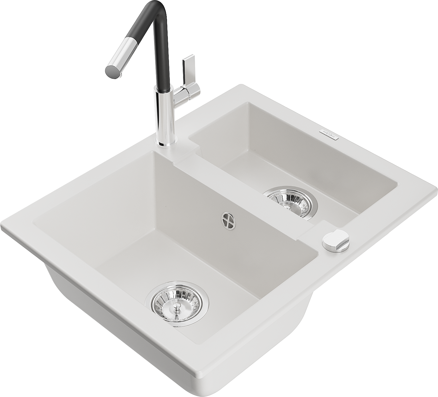 Mexen Carlos granitinis plautuvė 1,5 skylių su virtuvės maišytuvą Flora, balta - 6518-20-670401-07