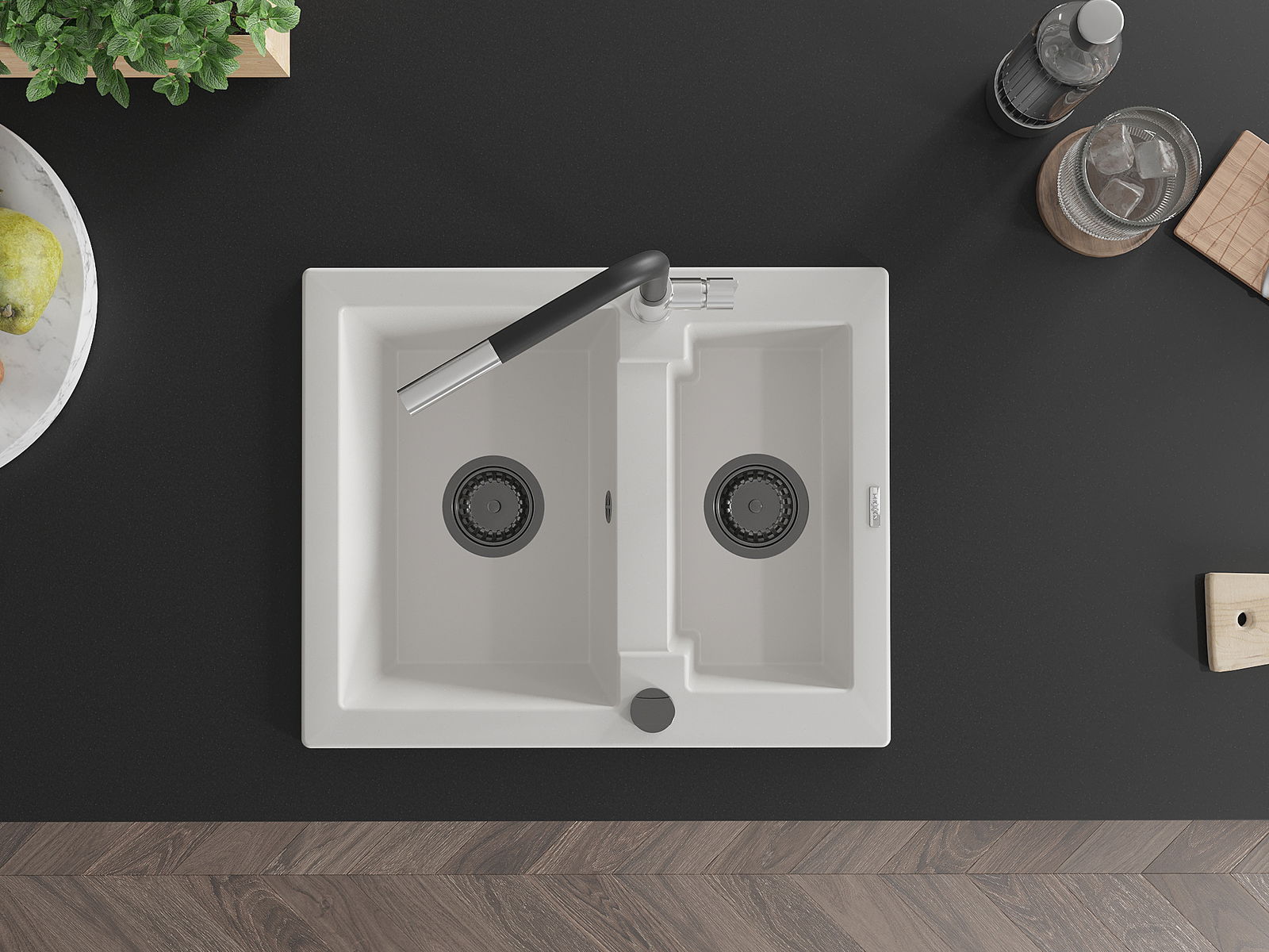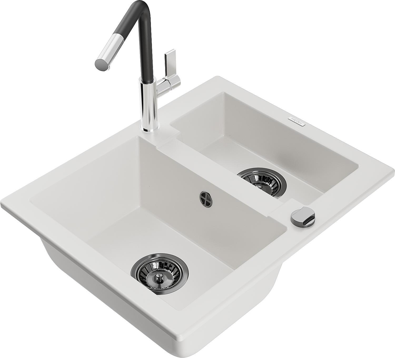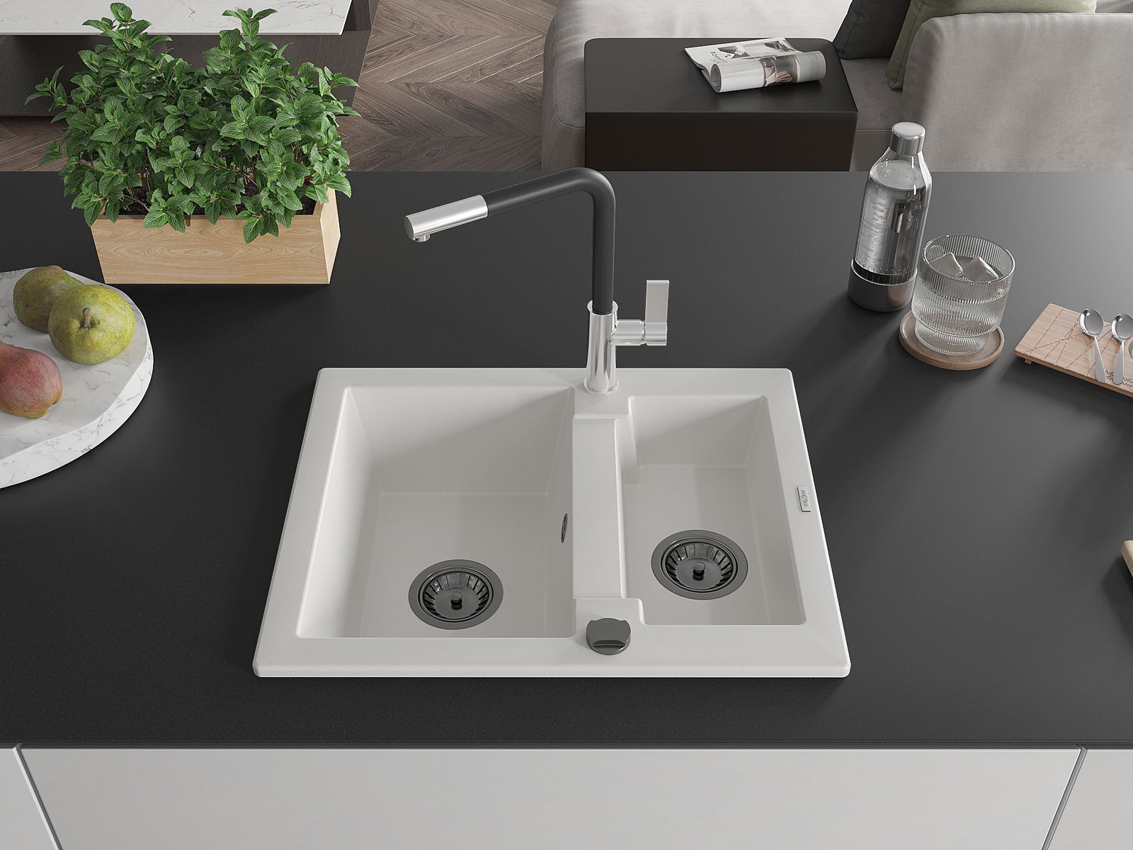 Mexen Carlos granitinis 1,5 dubenų virtuvės kriauklė su Flora maišytuvu, baltas - 6518-20-670401-07-B