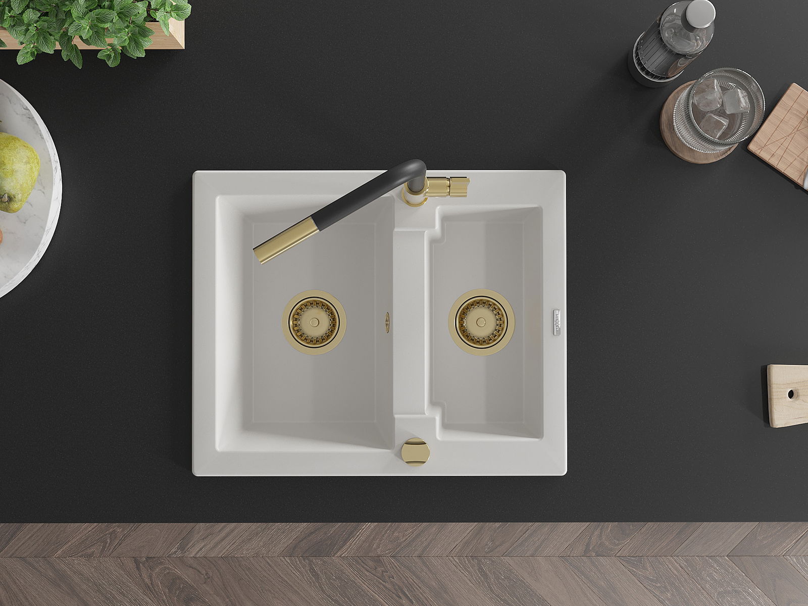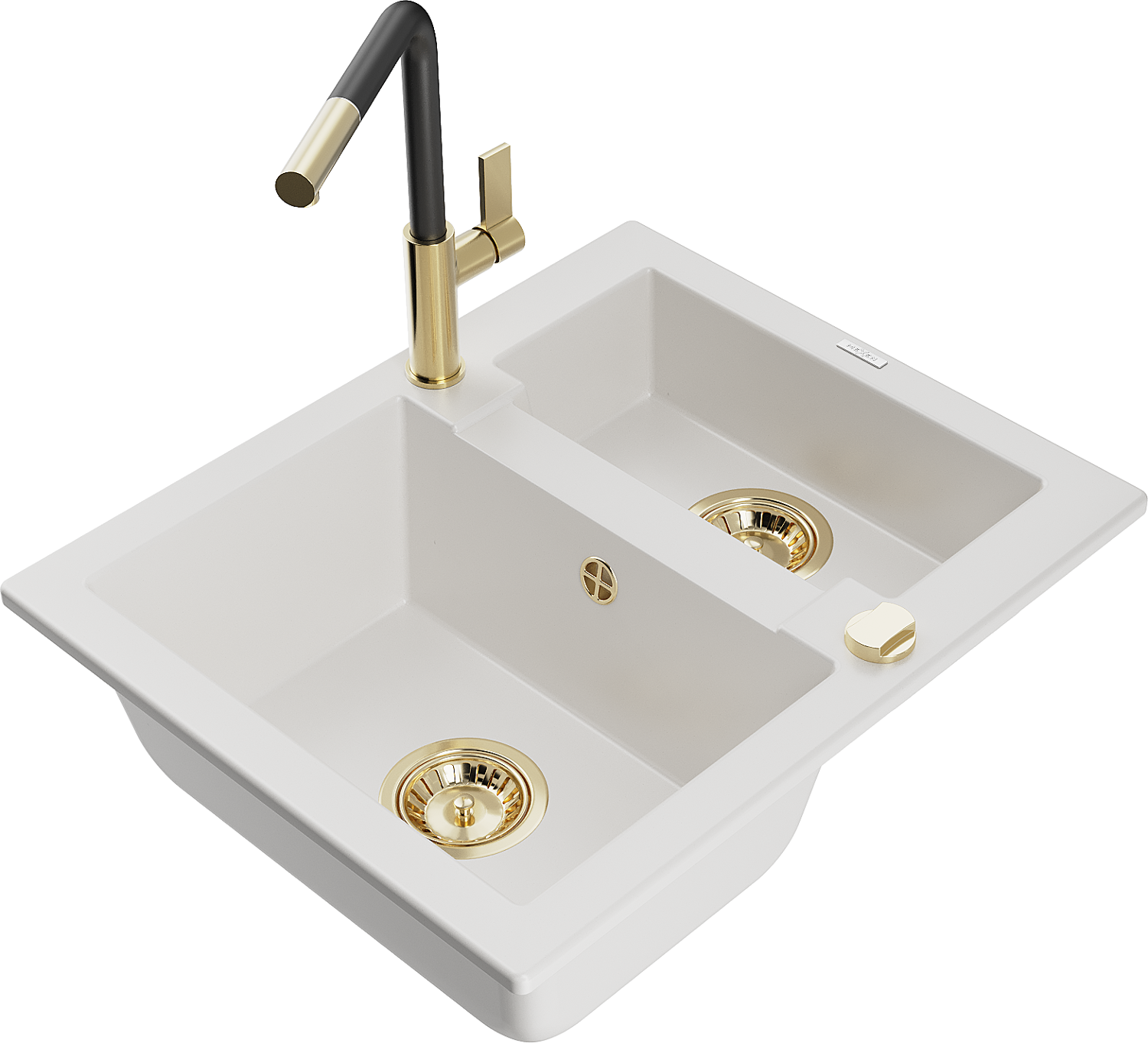 Mexen Carlos granitinė 1,5 skyrių virtuvės kriauklė su Flora maišytuvu, balta - 6518-20-670401-57-G