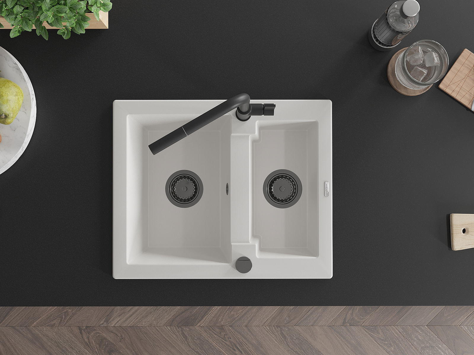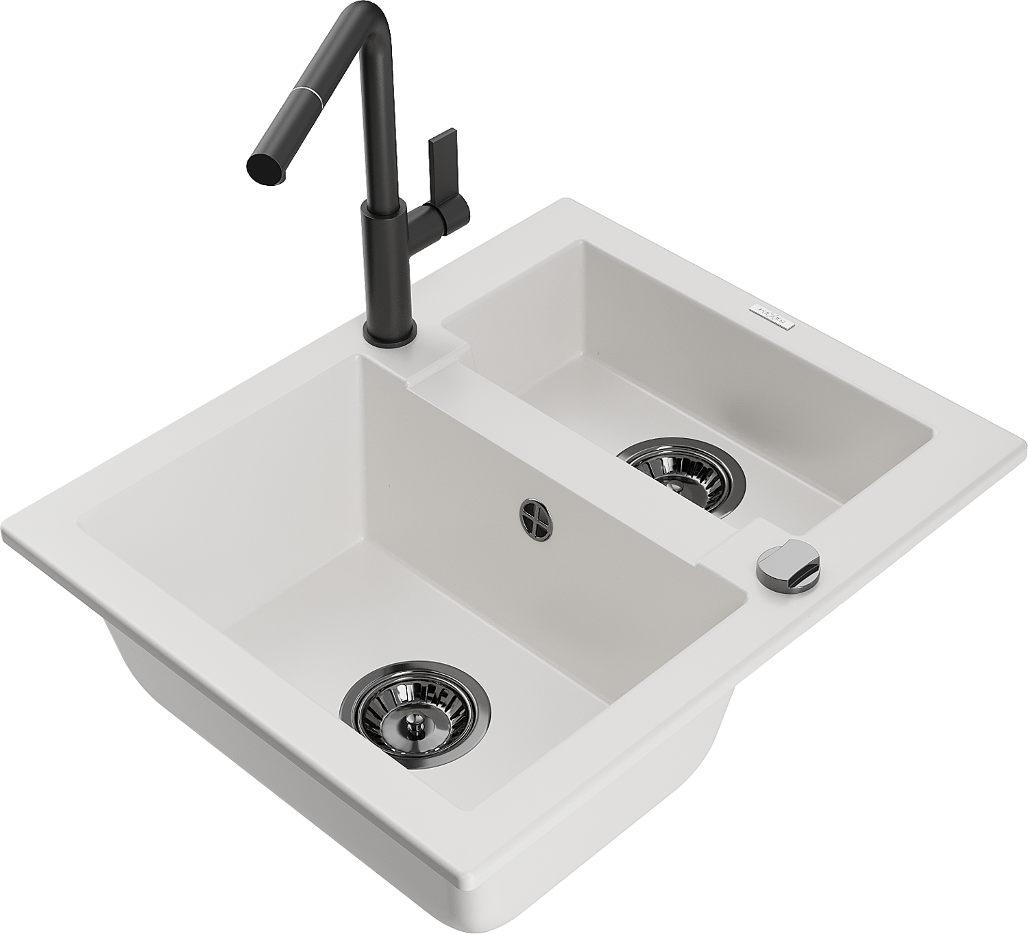 Mexen Carlos granito praustuvas 1,5 skylių su Flora virtuvės maišytuvu, baltas - 6518-20-670401-70-B