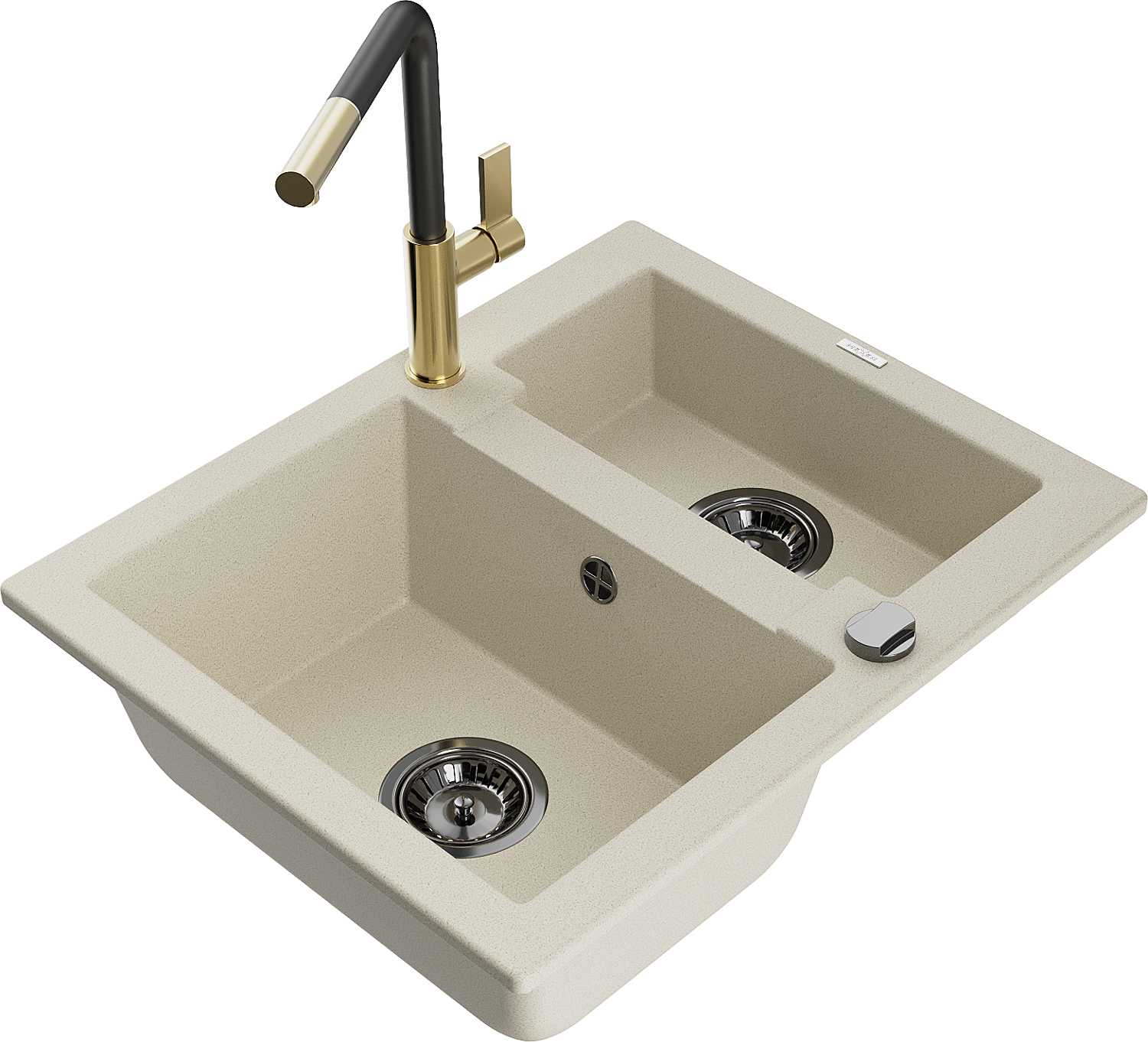 Mexen Carlos granitinė 1,5 kamerų plautuvė su Flora virtuviniu maišytuvu, smėlio spalvos - 6518-69-670401-57-B