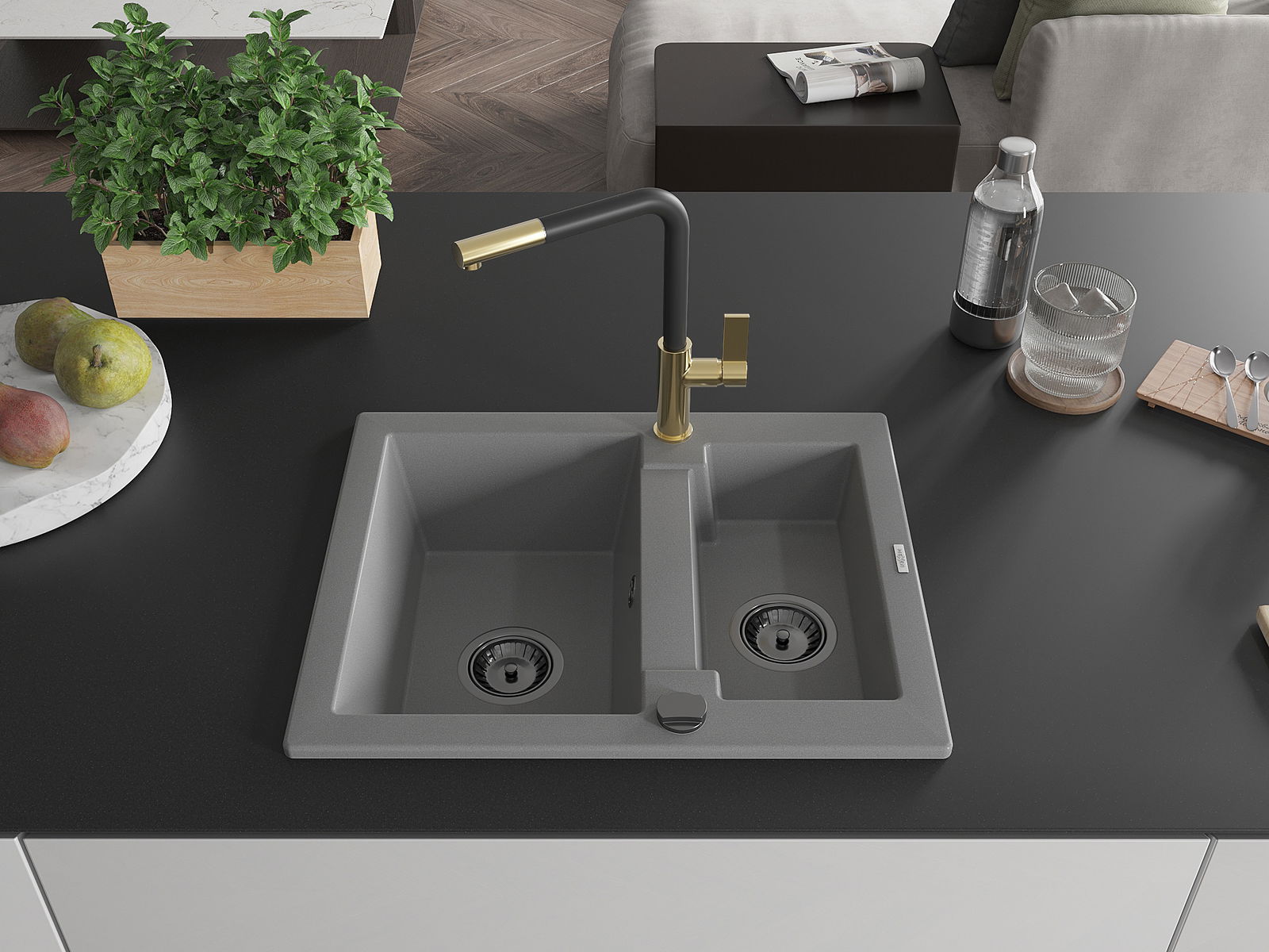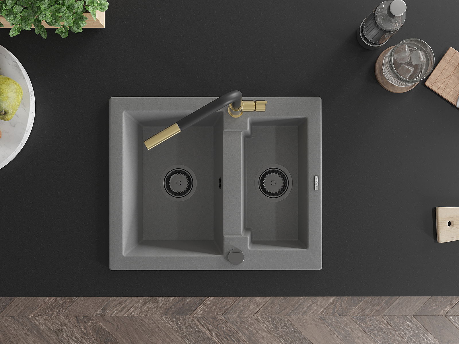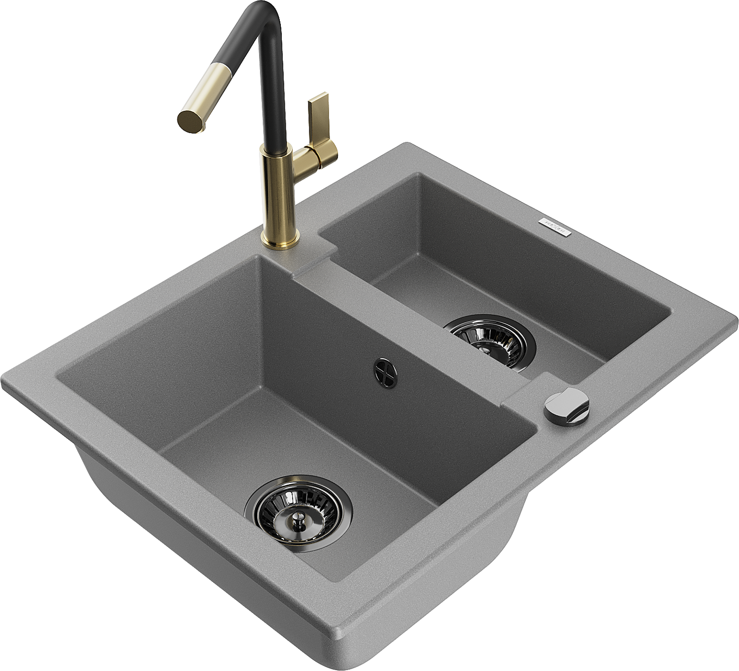 Mexen Carlos granitinė kriauklė 1,5-sekcijų su virtuvės maišytuvu Flora, pilka - 6518-71-670401-57-B