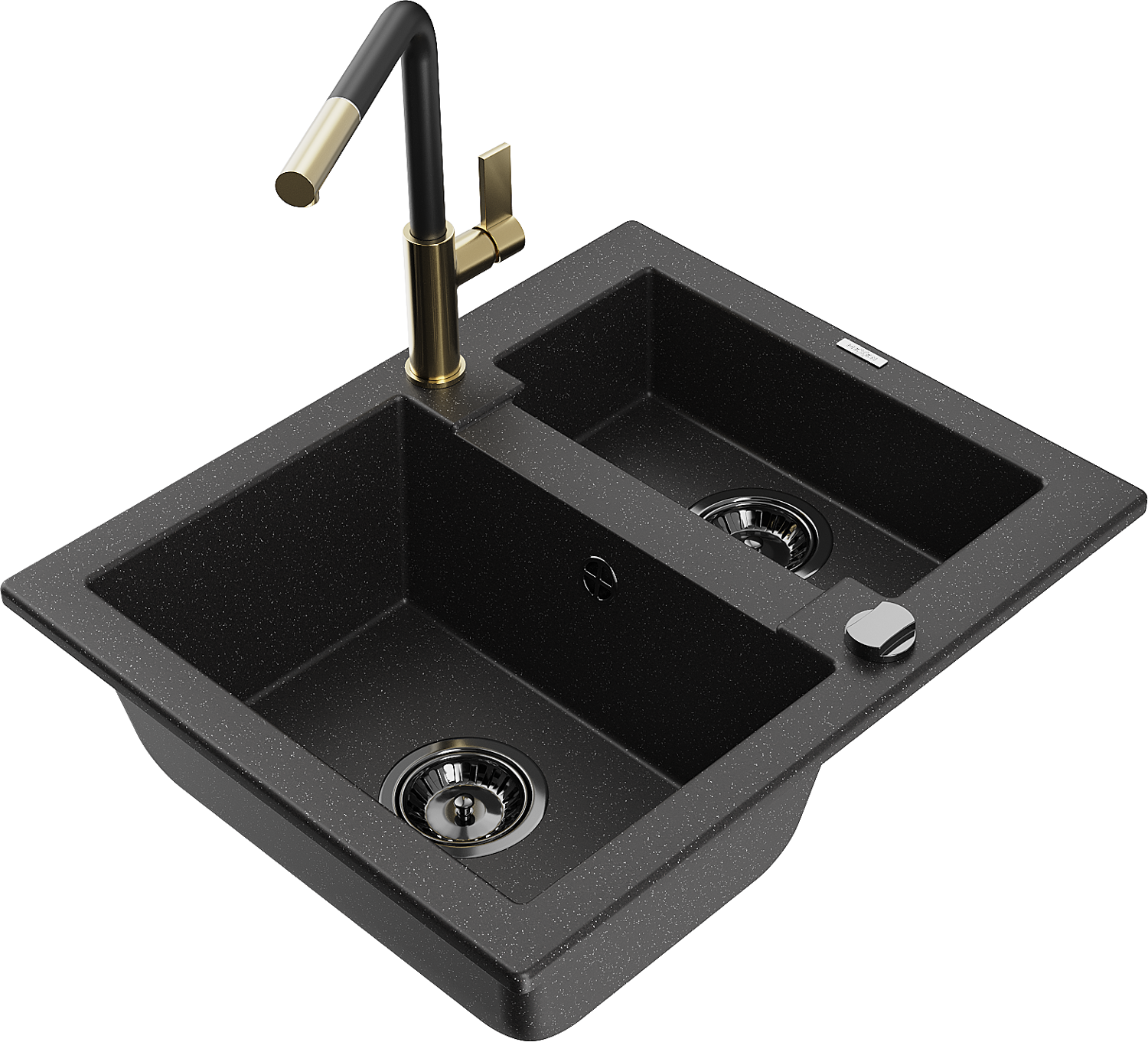 Mexen Carlos granitinė 1,5 skyrių kriauklė su Flora virtuvės maišytuvu, juoda/sidabrinė metalika - 6518-73-670401-57-B