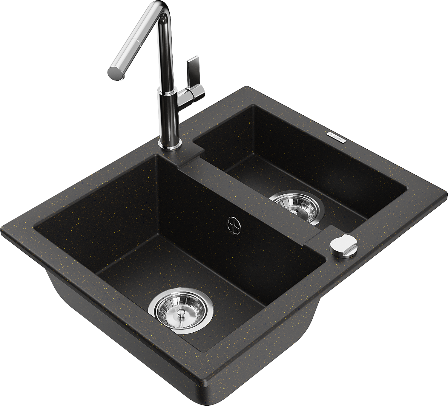 Mexen Carlos granitinis 1,5 skyrių plautuvė su virtuviniu maišytuvu Flora, juodas/auksinis metalikas - 6518-75-670401-00