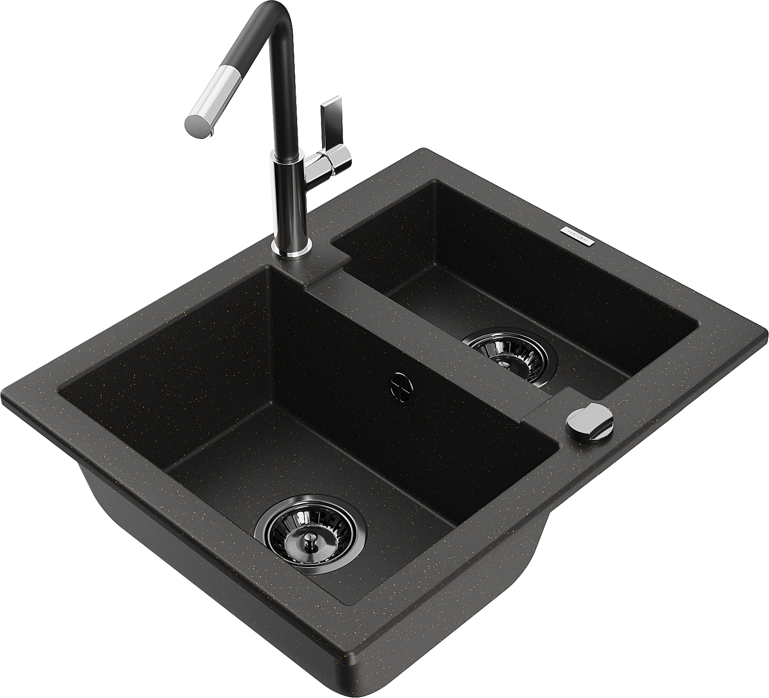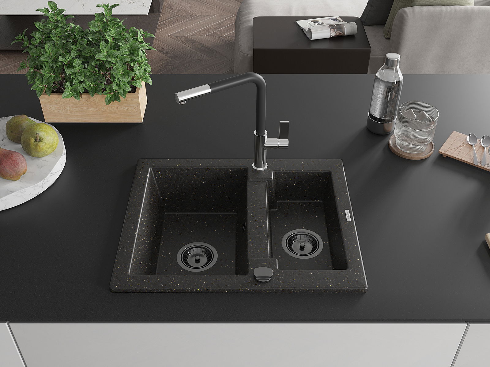 Mexen Carlos granitinis plautuvė 1,5 skyrių su Flora virtuviniu maišytuvu, juodas/aukso metalo spalva - 6518-75-670401-07-B