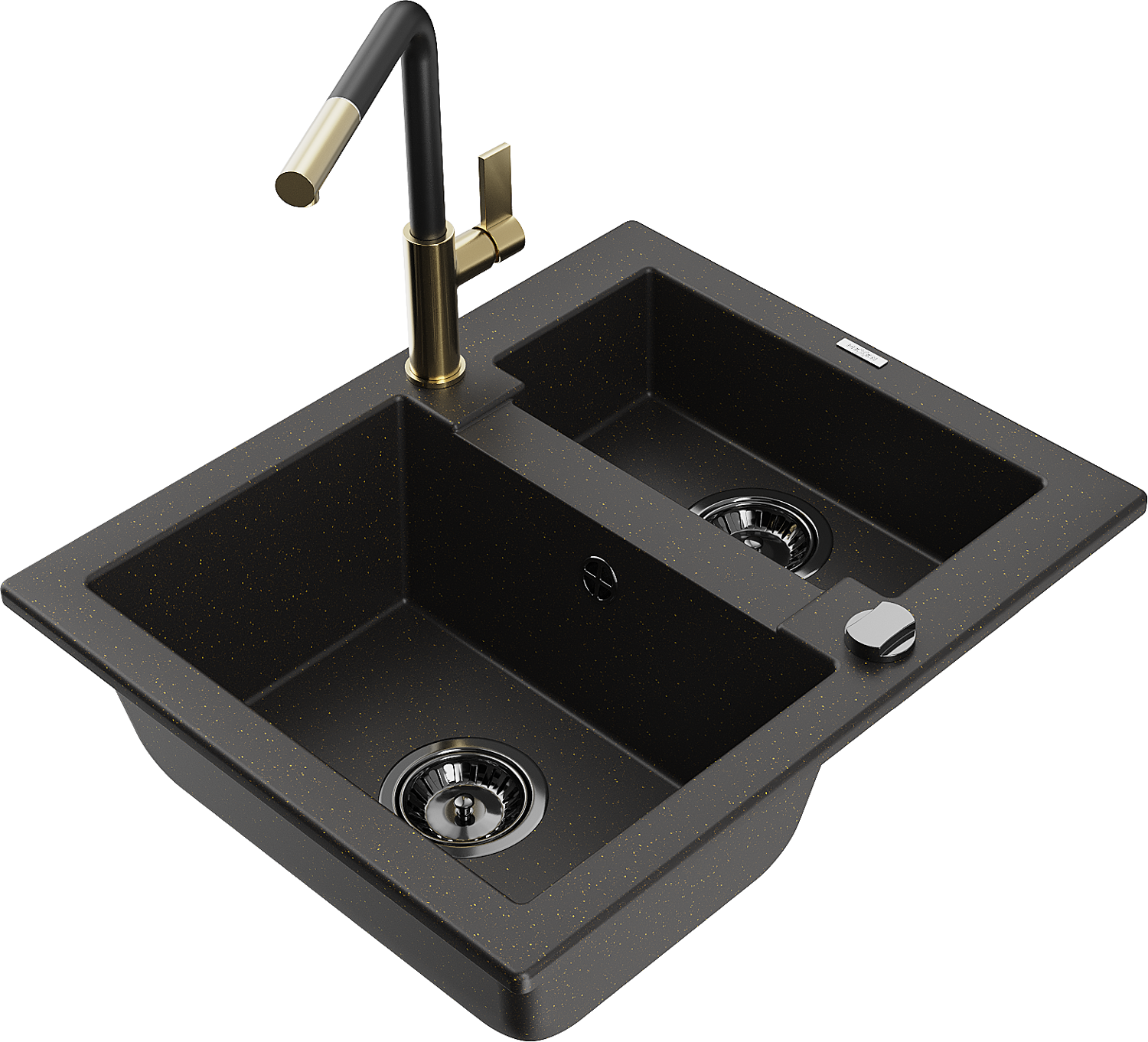 Mexen Carlos granitinė kriauklė 1,5 skyrių su Flora virtuviniu maišytuvu, juodas/auksinis metalikas - 6518-75-670401-57-B