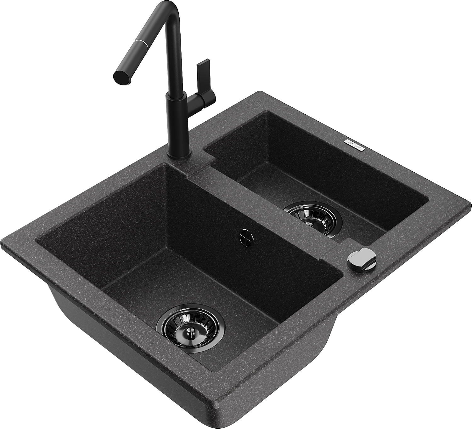Mexen Carlos granitinė kriauklė 1,5 skyrių su virtuviniu maišytuvu Flora, juoda taškuota - 6518-76-670401-70-B