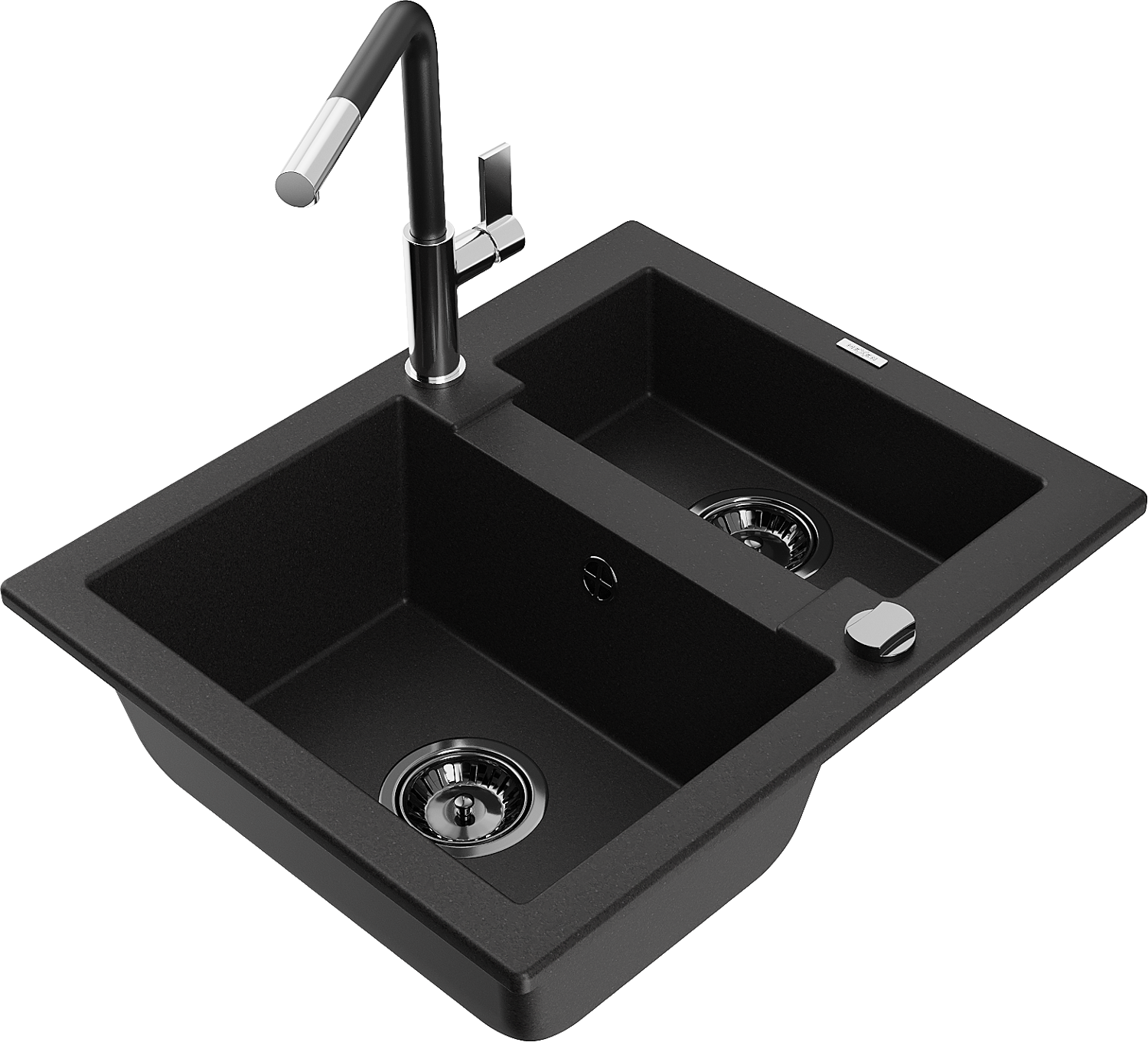 Mexen Carlos granitinė 1,5 kamerų plautuvė su virtuviniu maišytuvu Flora, juodas - 6518-77-670401-07-B