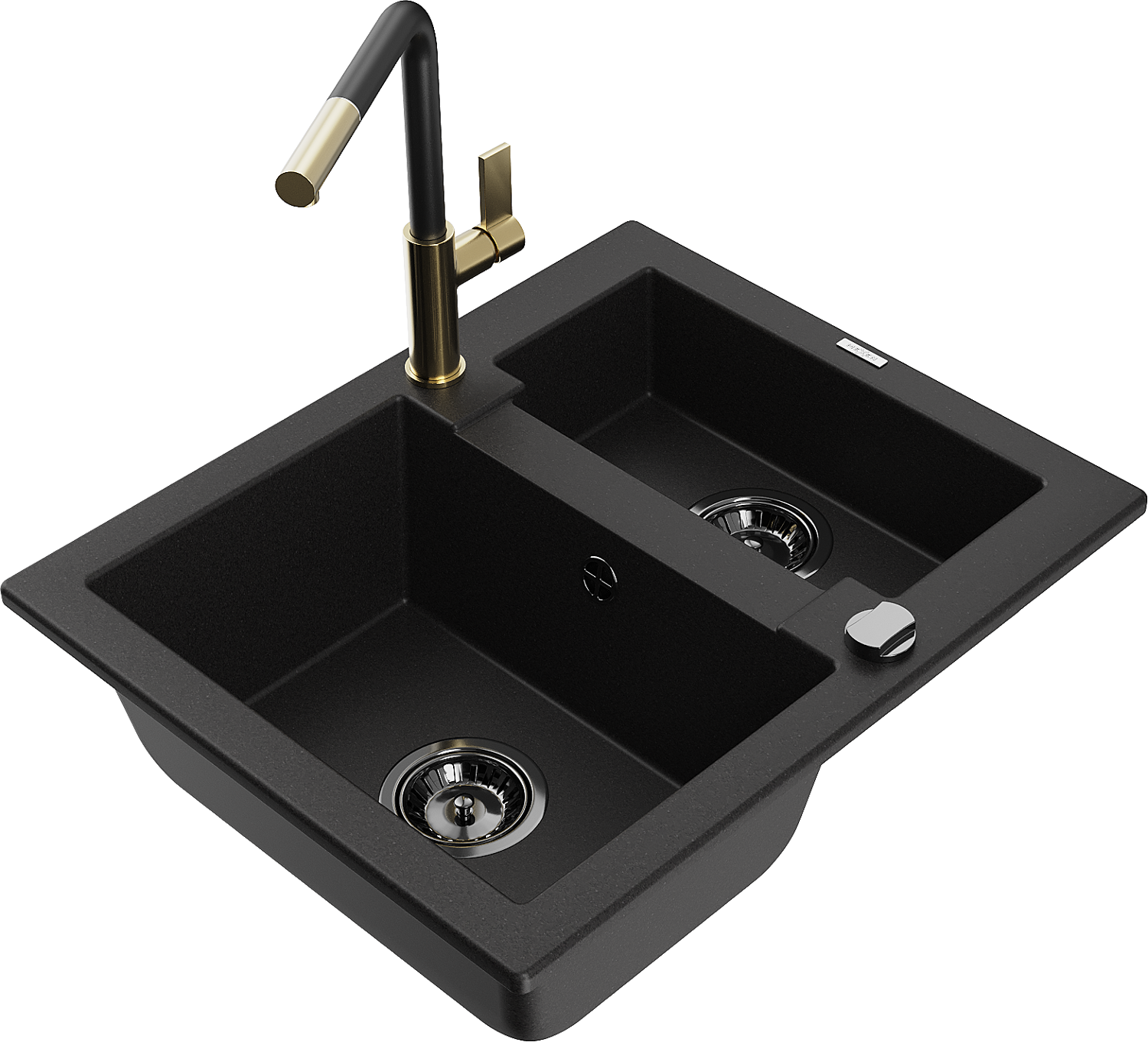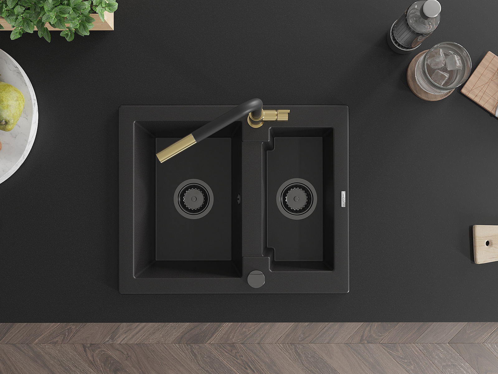 Mexen Carlos granitinė 1,5 skylių kriauklė su Flora virtuvės maišytuvu, juoda - 6518-77-670401-57-B