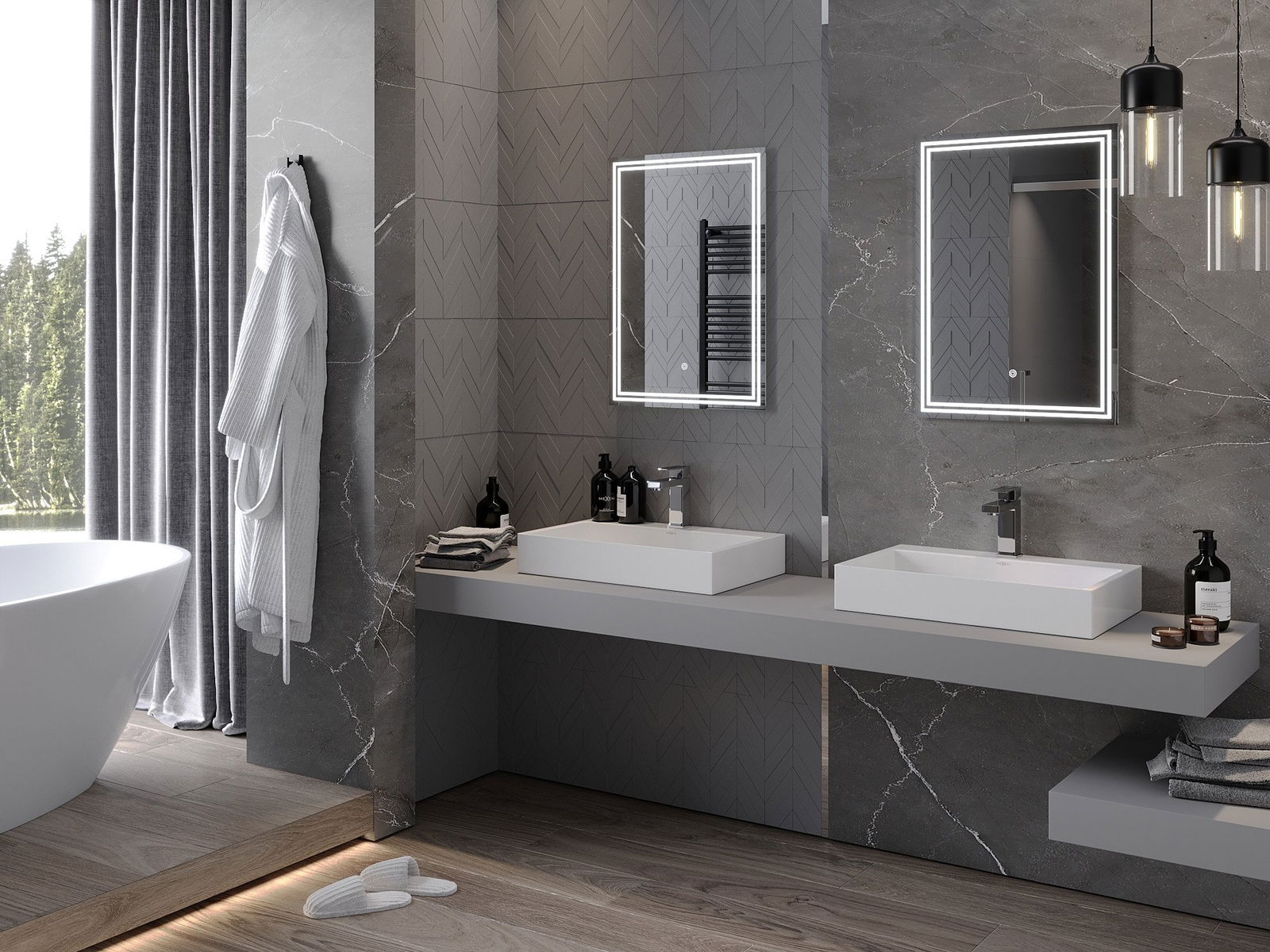 Produktas buvo aprūpintas šildymo kilimėliu, dėl kurio veidrodis niekada nėra rūko, net po ilgos ir karštos vonios. Kilimėlis pradeda naudoti apšvietimo jungiklį, užtikrindamas patogumą ir lengvą naudojimą.