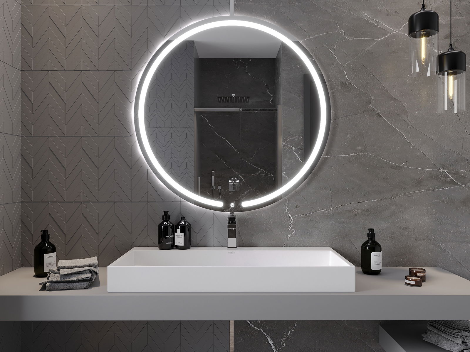 Veidrodinį apšvietimą galima paleisti paprastu ir patogiu būdu, liečiant jungiklį ant veidrodžio paviršiaus. Tai leidžia greitai apšviesti, neprivalant pasiekti tolesnio tradicinio apšvietimo jungiklio.