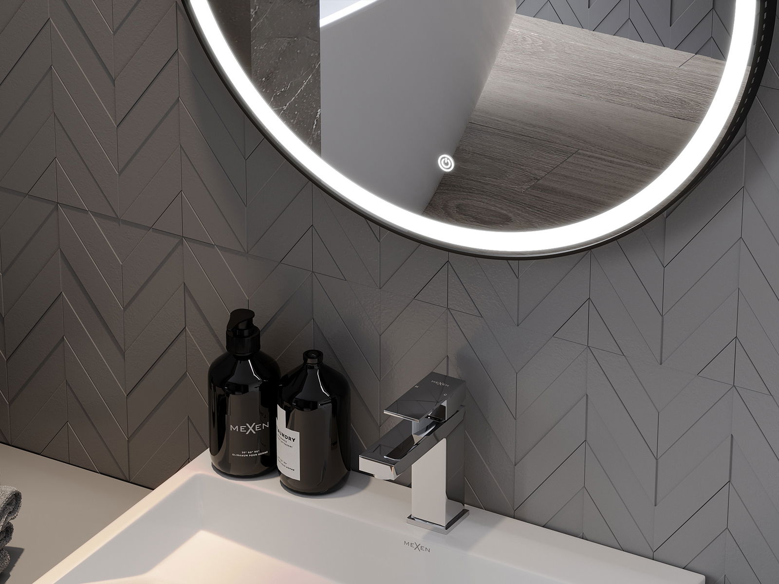 Veidrodžio apšvietimą galima paprastai ir patogiai įjungti palietus jungiklį veidrodžio paviršiuje. Tai leidžia greitai apšviesti, nereikia ieškoti toliau esančio tradicinio apšvietimo jungiklio.