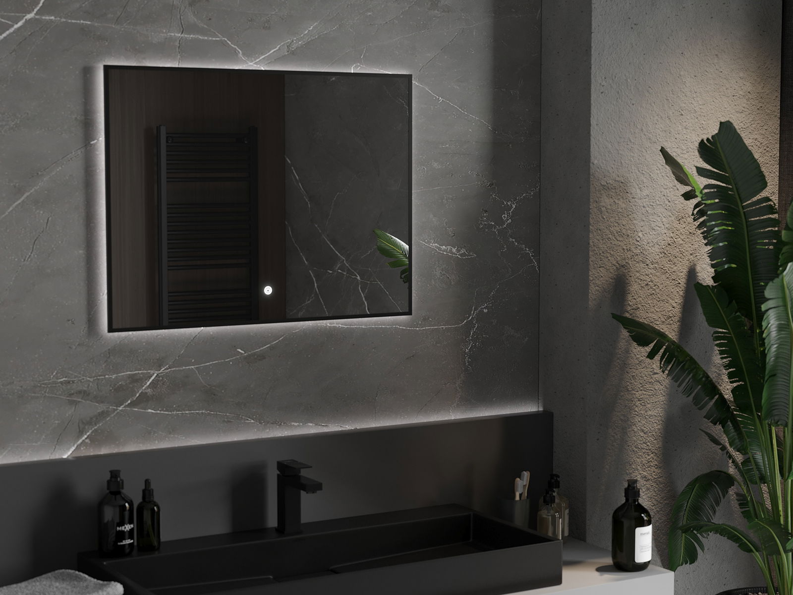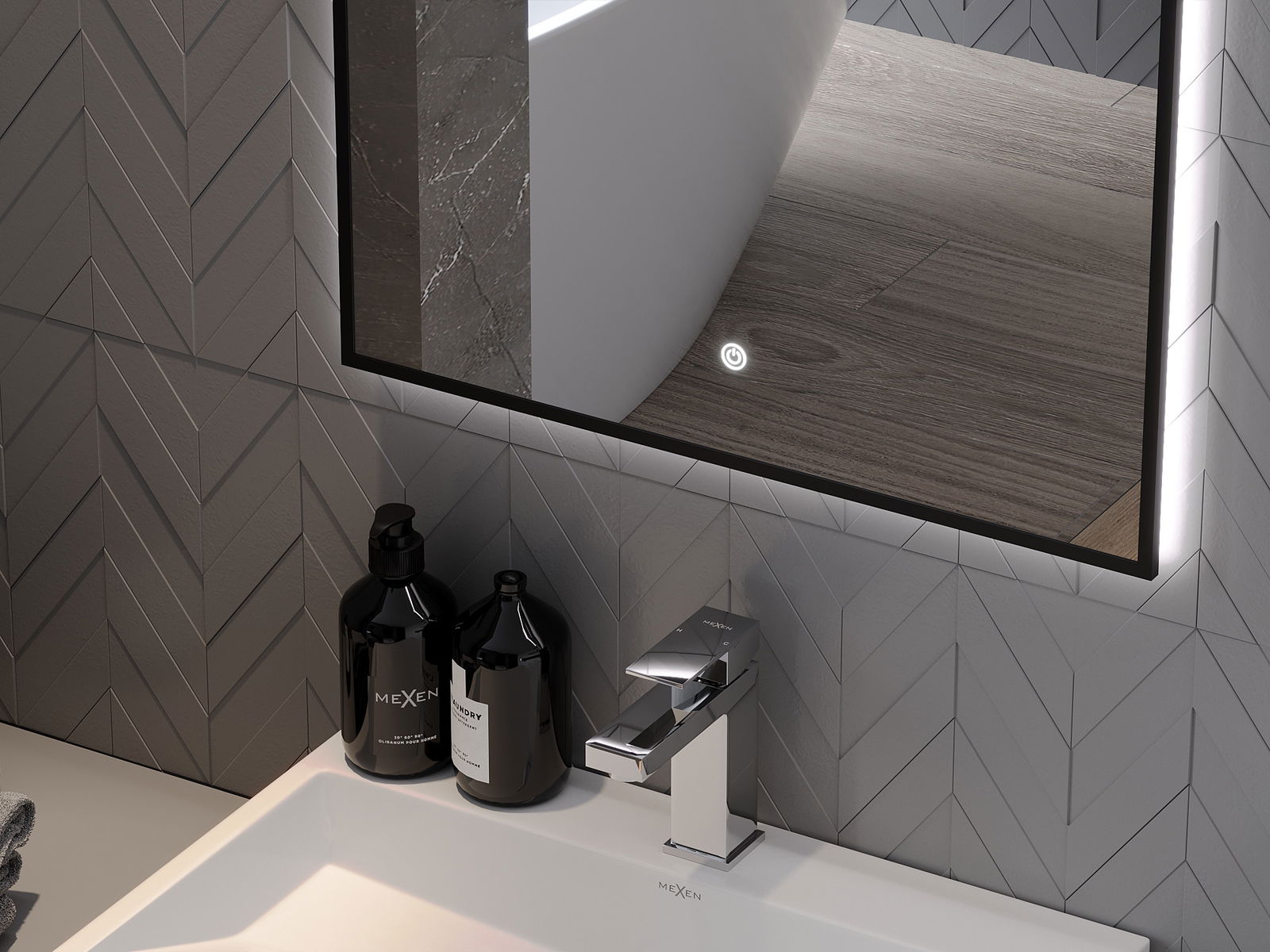 Veidrodžio apšvietimą galima paprastai ir patogiai įjungti palietus jungiklį veidrodžio paviršiuje. Tai leidžia greitai apšviesti, nereikia ieškoti toliau esančio tradicinio apšvietimo jungiklio.