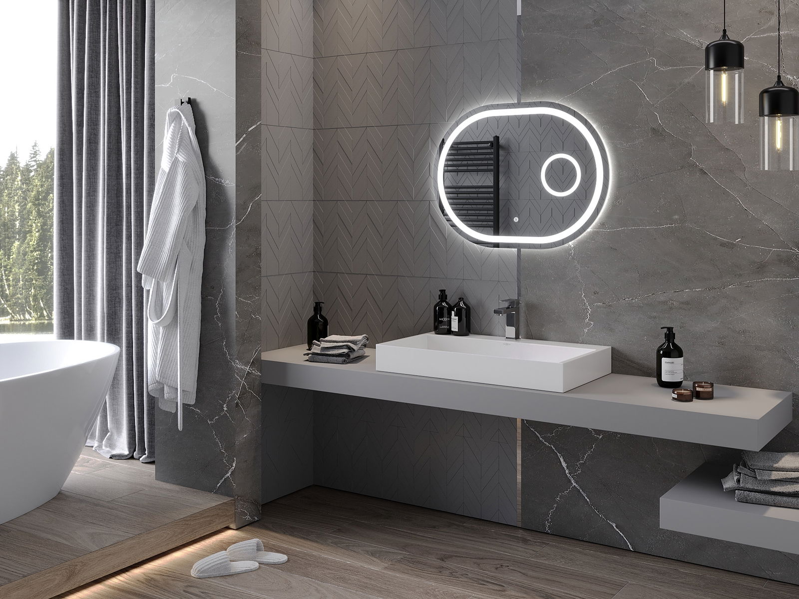 Veidrodinį apšvietimą galima paleisti paprastu ir patogiu būdu, liečiant jungiklį ant veidrodžio paviršiaus. Tai leidžia greitai apšviesti, neprivalant pasiekti tolesnio tradicinio apšvietimo jungiklio.