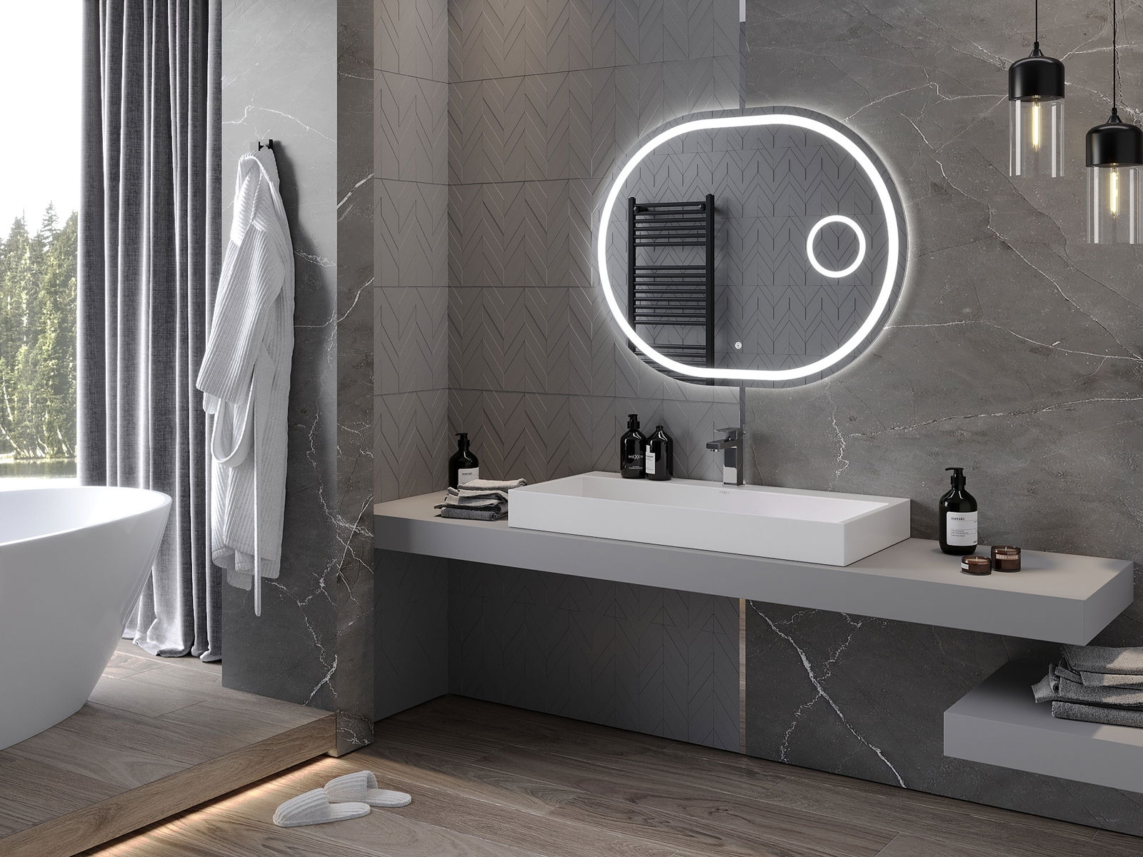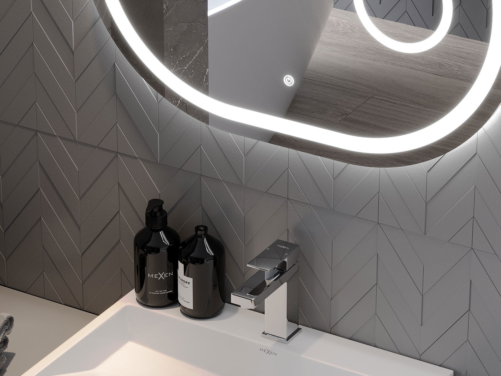 Veidrodžio apšvietimą galima paprastai ir patogiai įjungti palietus jungiklį veidrodžio paviršiuje. Tai leidžia greitai apšviesti, nereikia ieškoti toliau esančio tradicinio apšvietimo jungiklio.