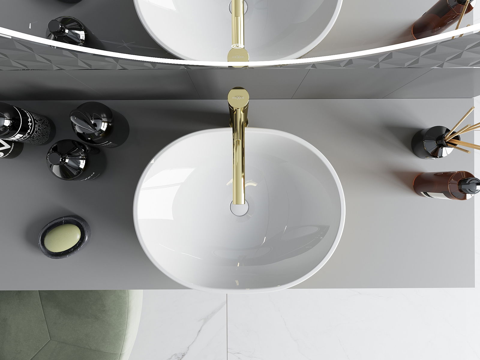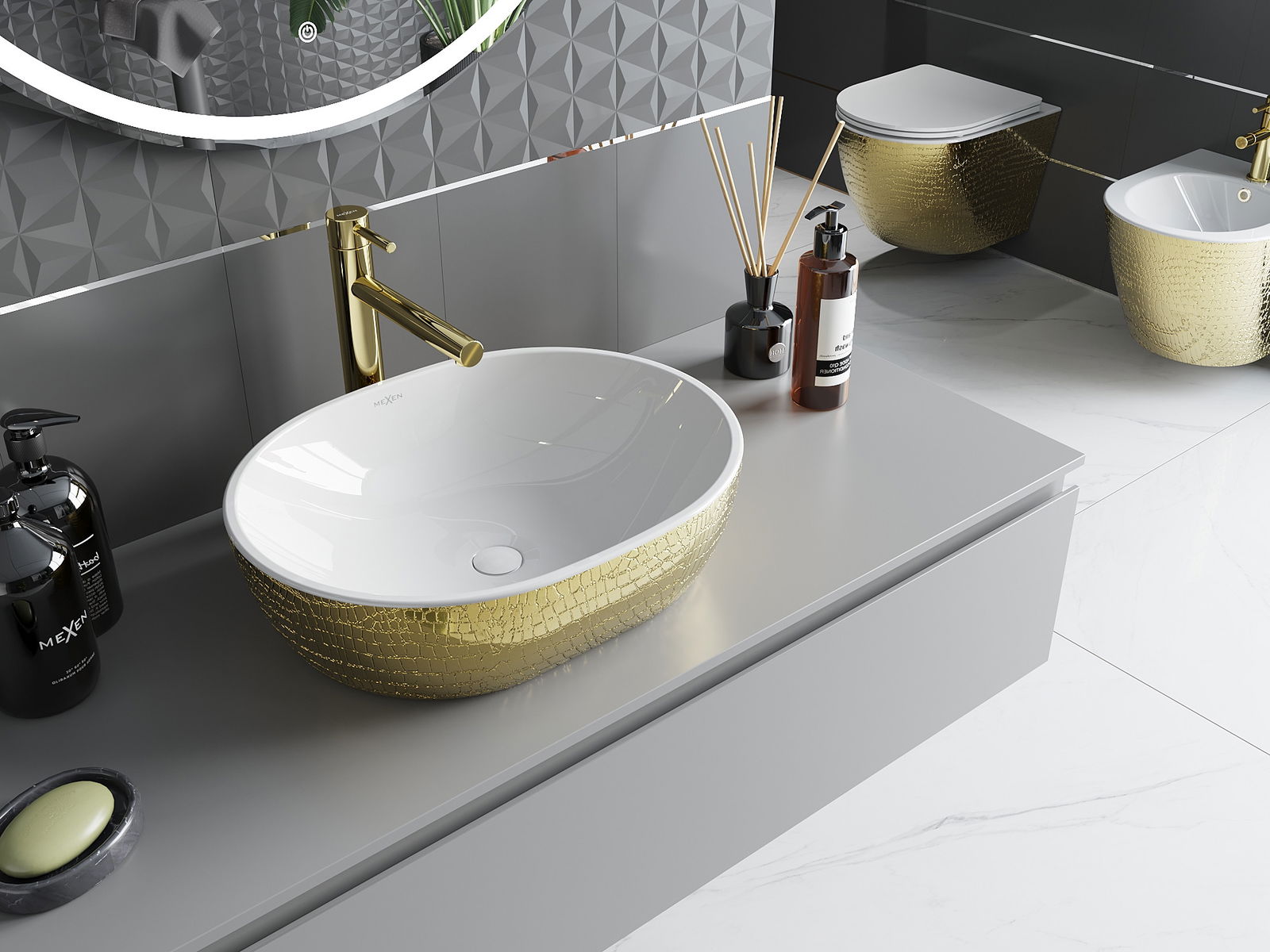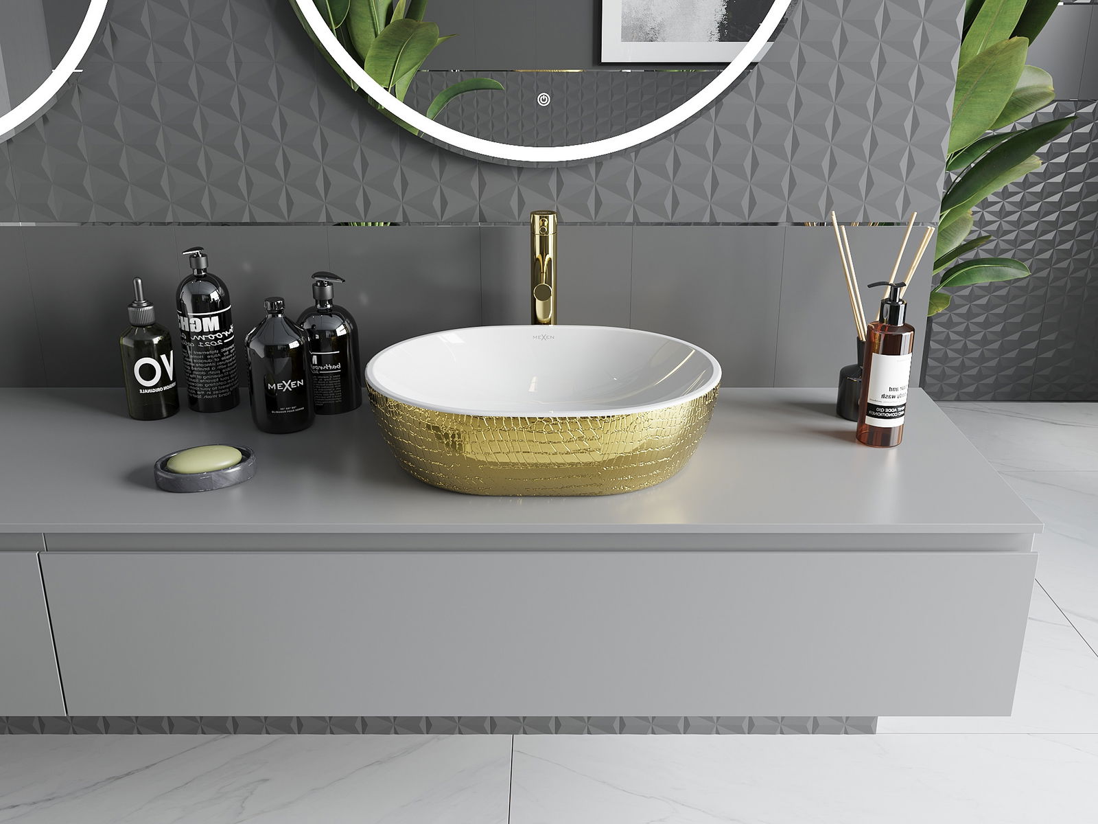 Mexen Viki stalviršinis praustuvas 48 x 35 cm, baltas/auksinis žvynų raštas - 21054808
