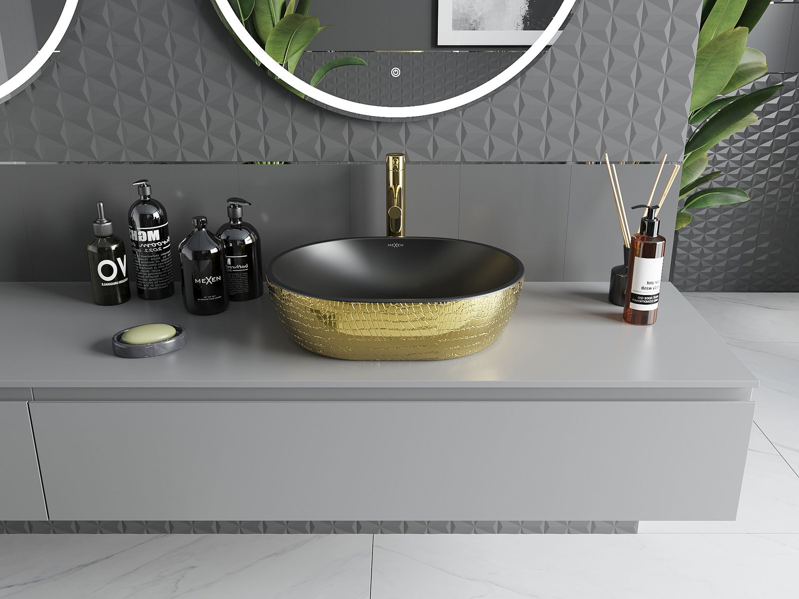 Mexen Viki kriauklė ant stalviršio 48 x 35 cm, juoda matinė/auksinis žvynų raštas - 21054878