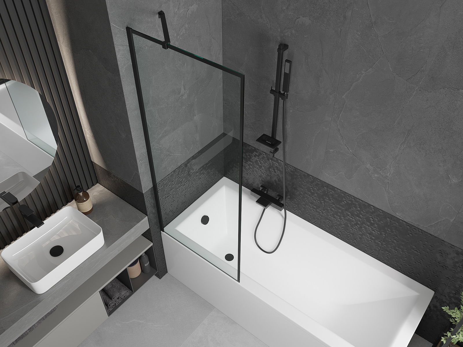 Efektyvi apsauga nuo vandens išsiliejimo maudymosi metu. Sienelė turi tarpines, kurios idealiai priglunda prie stiklo paviršiaus ir vonios krašto. Funkcionalus sprendimas, užtikrinantis saugumą ir lengvą švaros palaikymą.