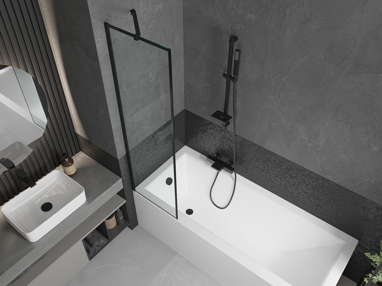 Efektyvi apsauga nuo vandens išsiliejimo maudymosi metu. Sienelė turi tarpines, kurios idealiai priglunda prie stiklo paviršiaus ir vonios krašto. Funkcionalus sprendimas, užtikrinantis saugumą ir lengvą švaros palaikymą.