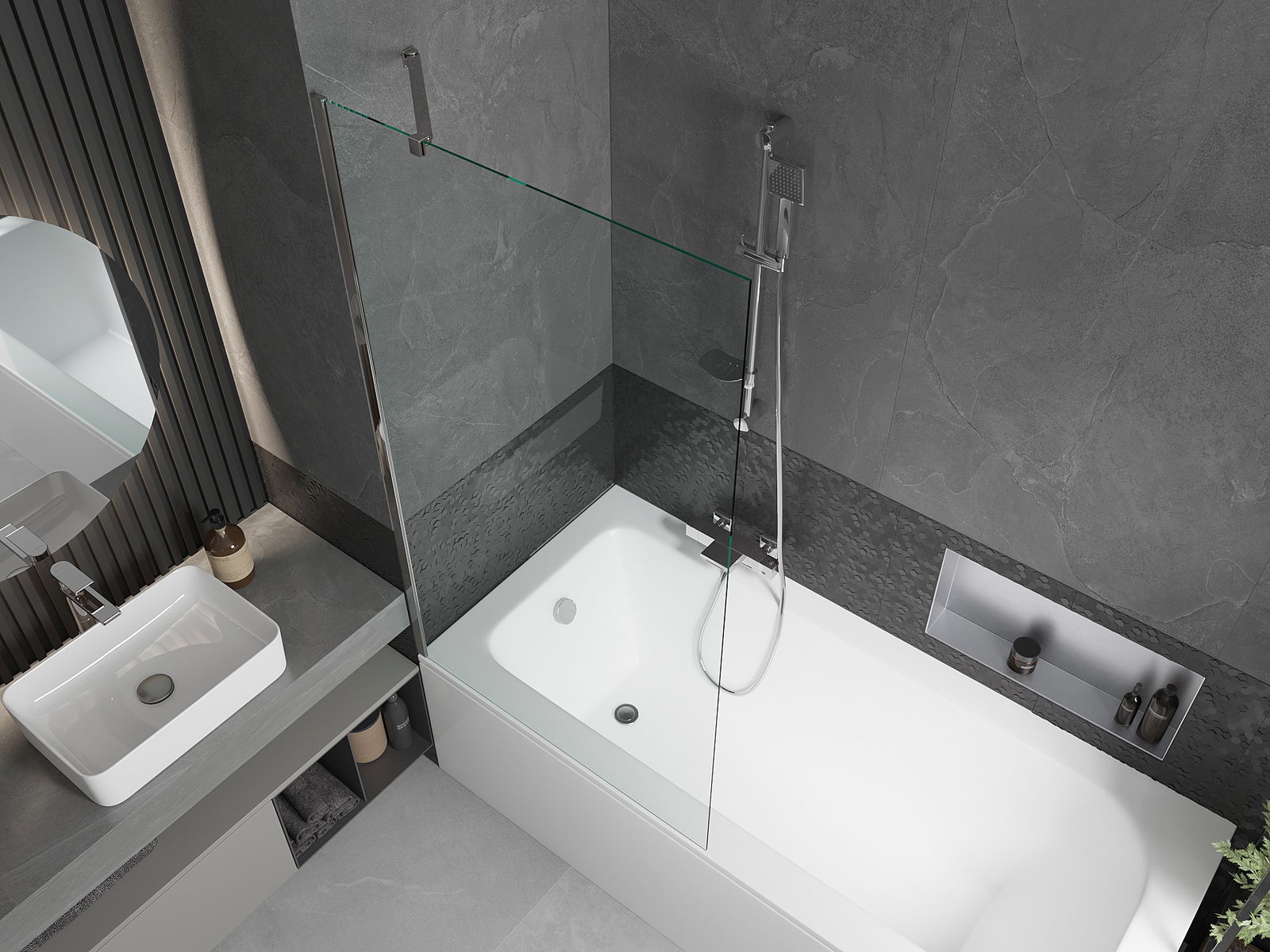 Efektyvi apsauga nuo vandens išsiliejimo maudymosi metu. Sienelė turi tarpines, kurios idealiai priglunda prie stiklo paviršiaus ir vonios krašto. Funkcionalus sprendimas, užtikrinantis saugumą ir lengvą švaros palaikymą.