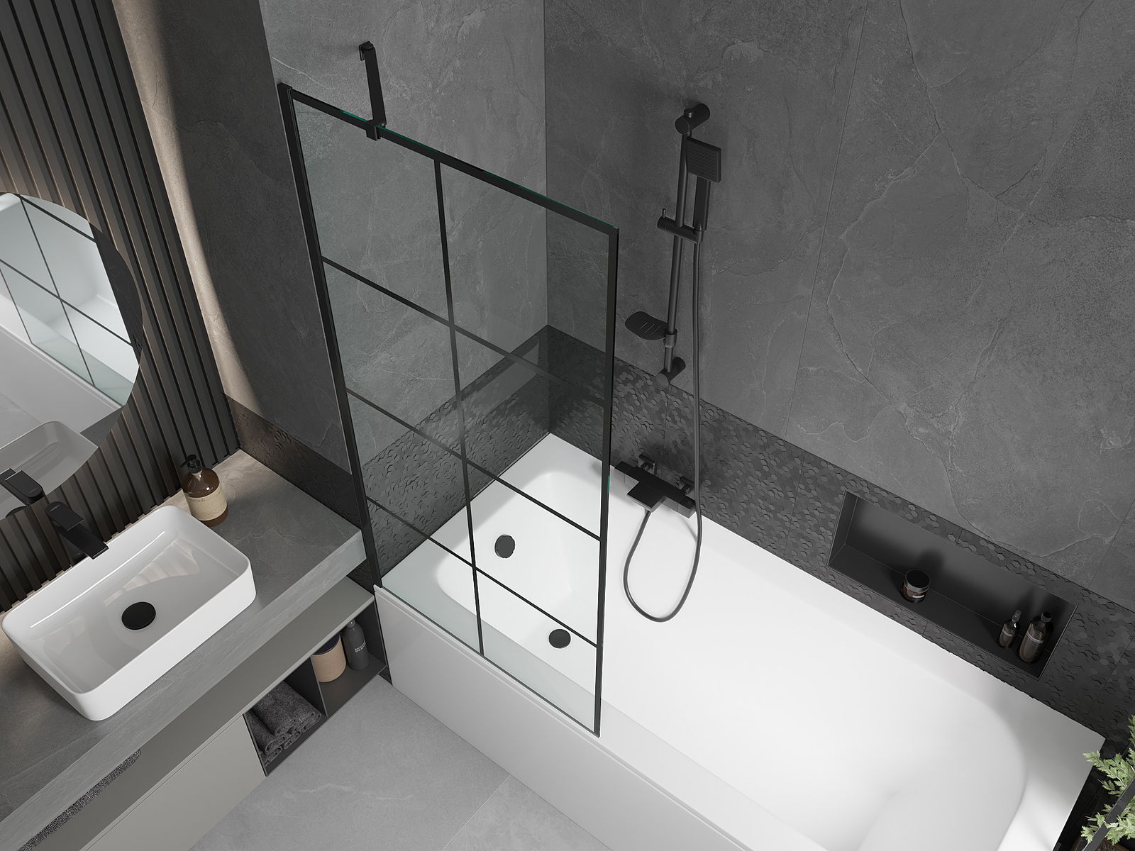 Efektyvi apsauga nuo vandens išsiliejimo maudymosi metu. Sienelė turi tarpines, kurios idealiai priglunda prie stiklo paviršiaus ir vonios krašto. Funkcionalus sprendimas, užtikrinantis saugumą ir lengvą švaros palaikymą.