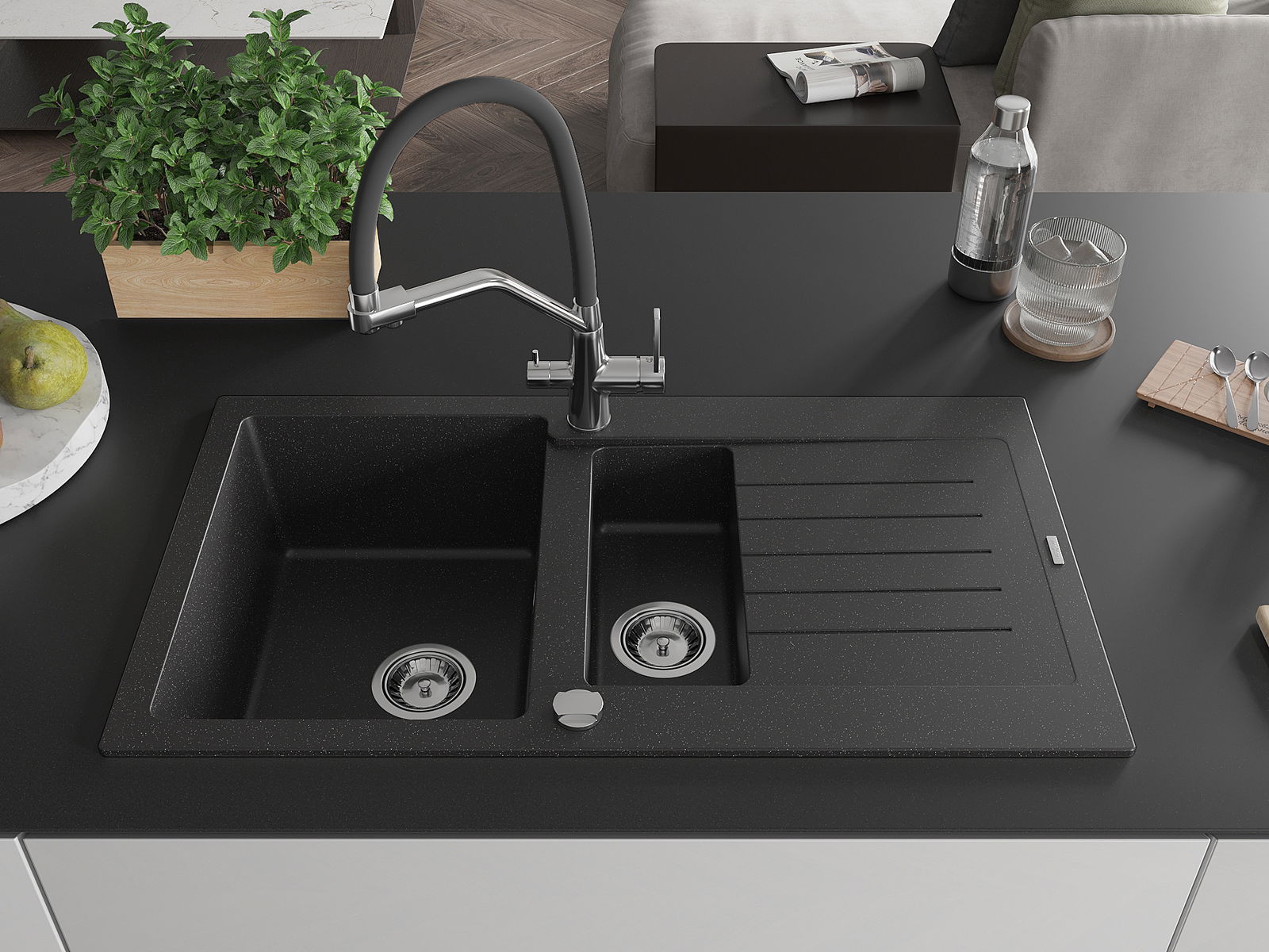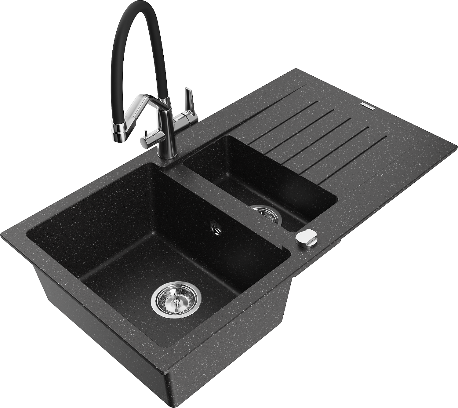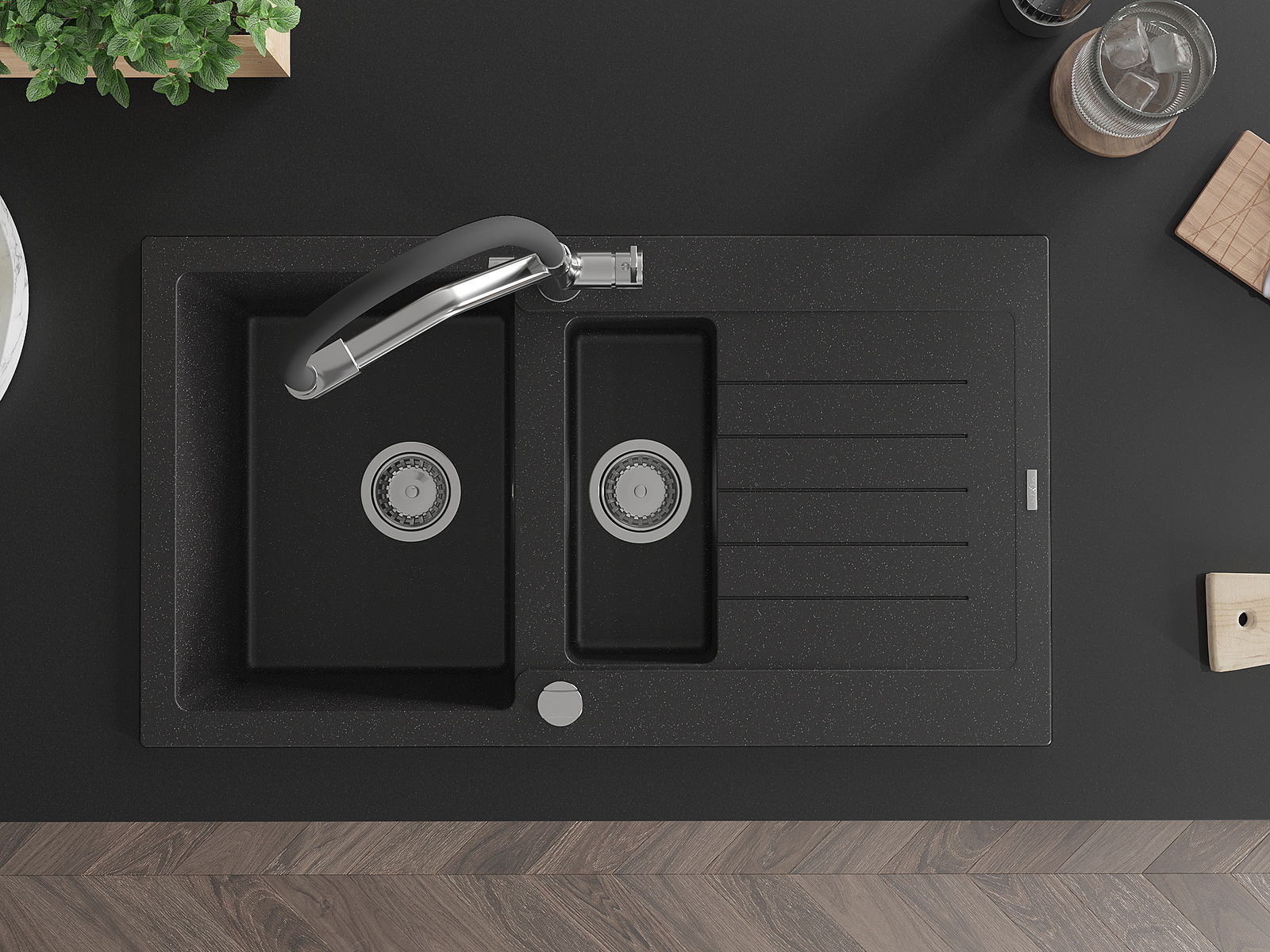 Mexen Matias granitinė 1,5-kameros plautuvė su nusausintuvu ir virtuviniu maišytuvu Duo, juoda/sidabrinis metalikas