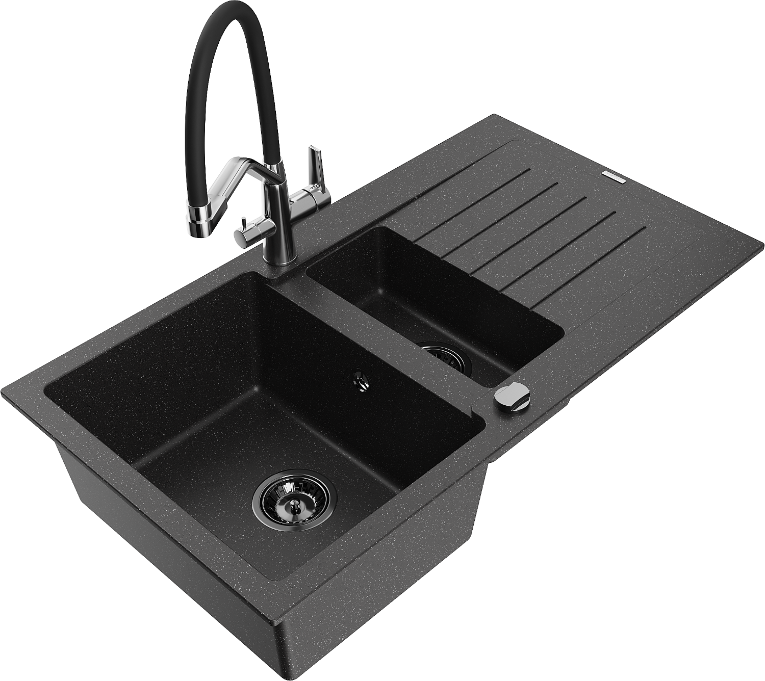 Mexen Matias granitinė plautuvė 1,5 kamerų su nutekėjimu ir Duo virtuviniu maišytuvu, juoda/sidabrinė - 6502-73-671701-07-B