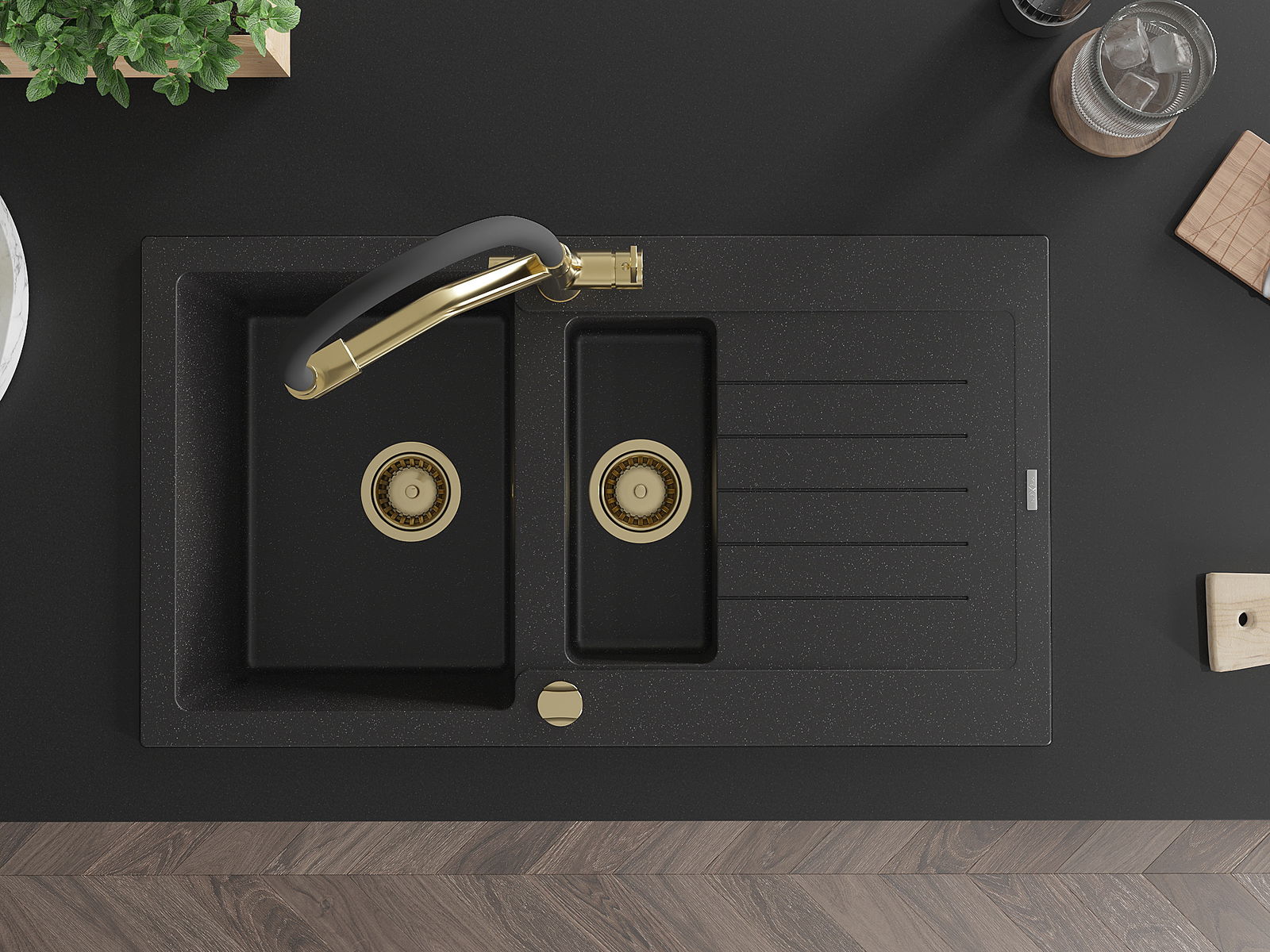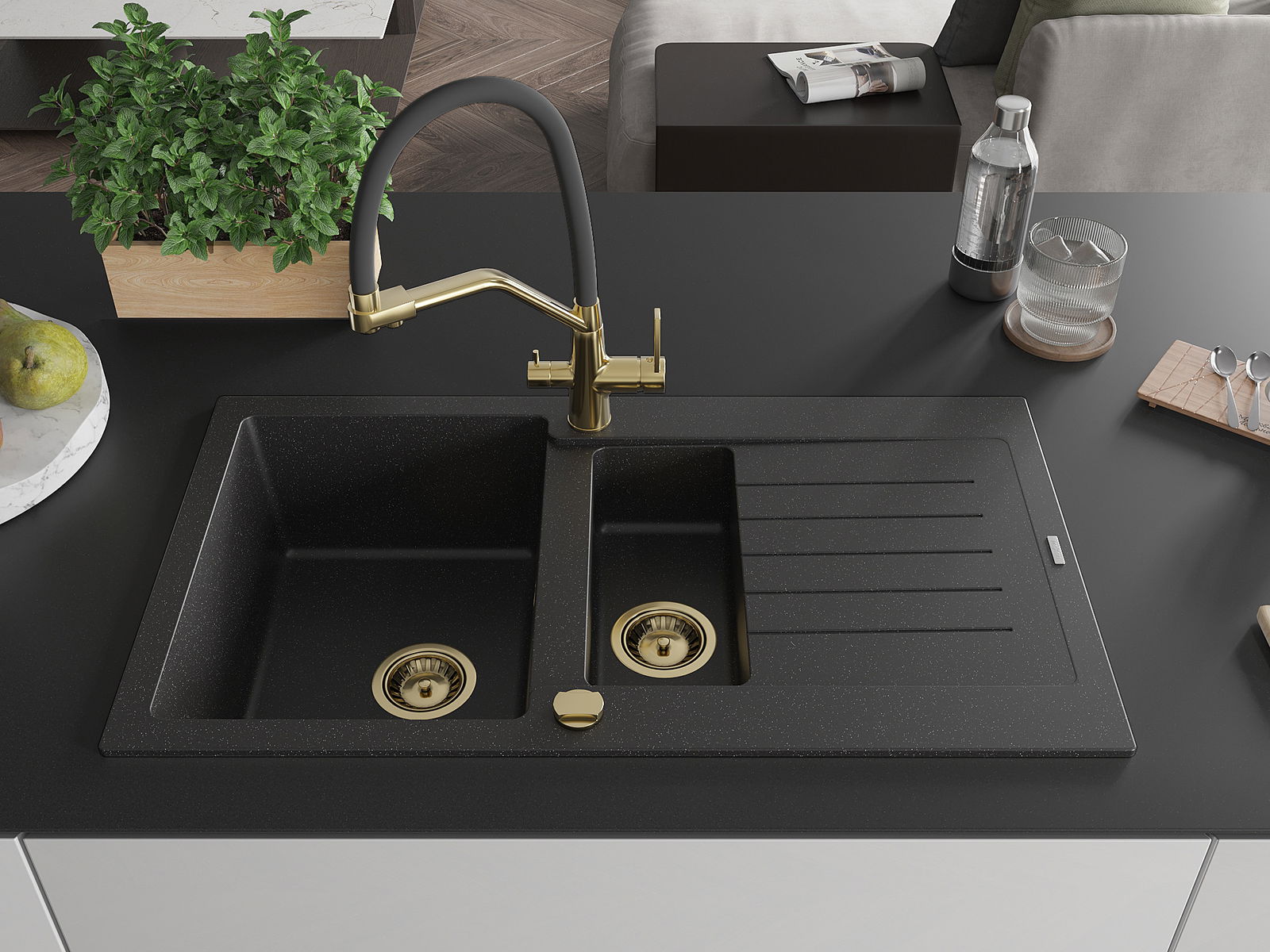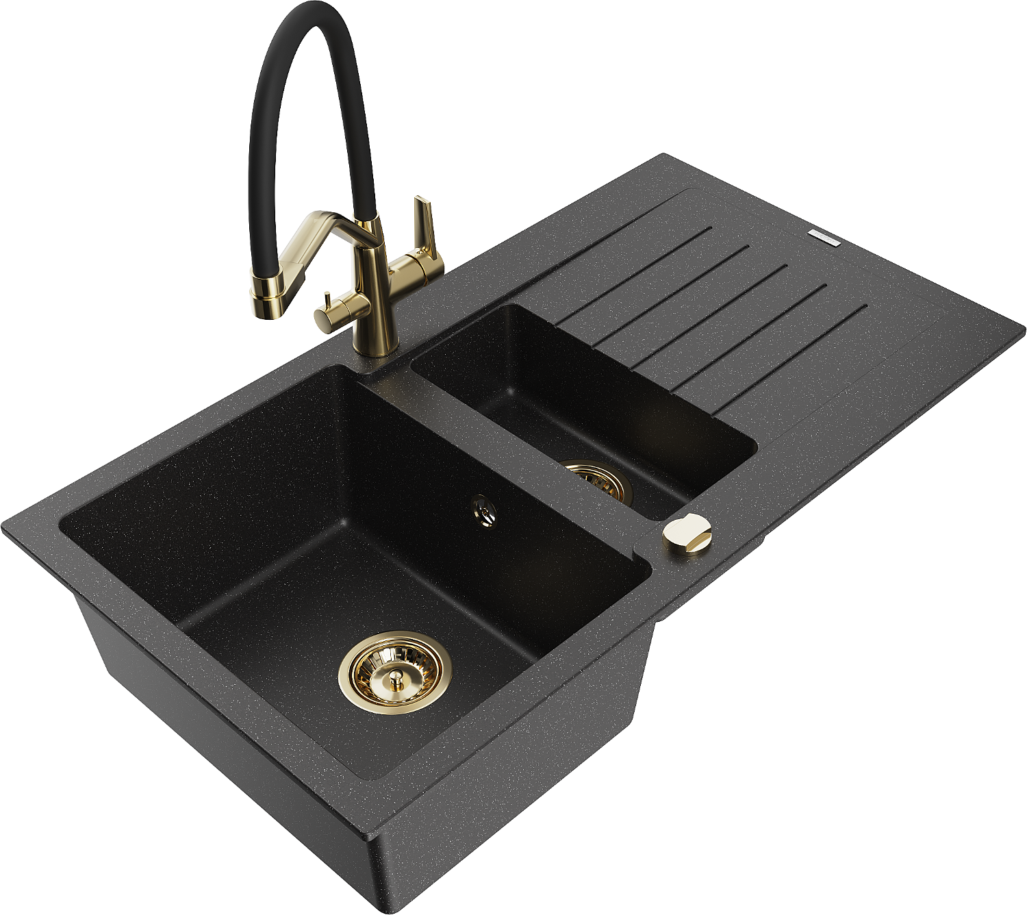 Mexen Matias granitinė 1,5 skyrių kriauklė su nutekėjimu ir virtuvės maišytuvu Duo, juoda/sidabrinė - 6502-73-671701-57-G