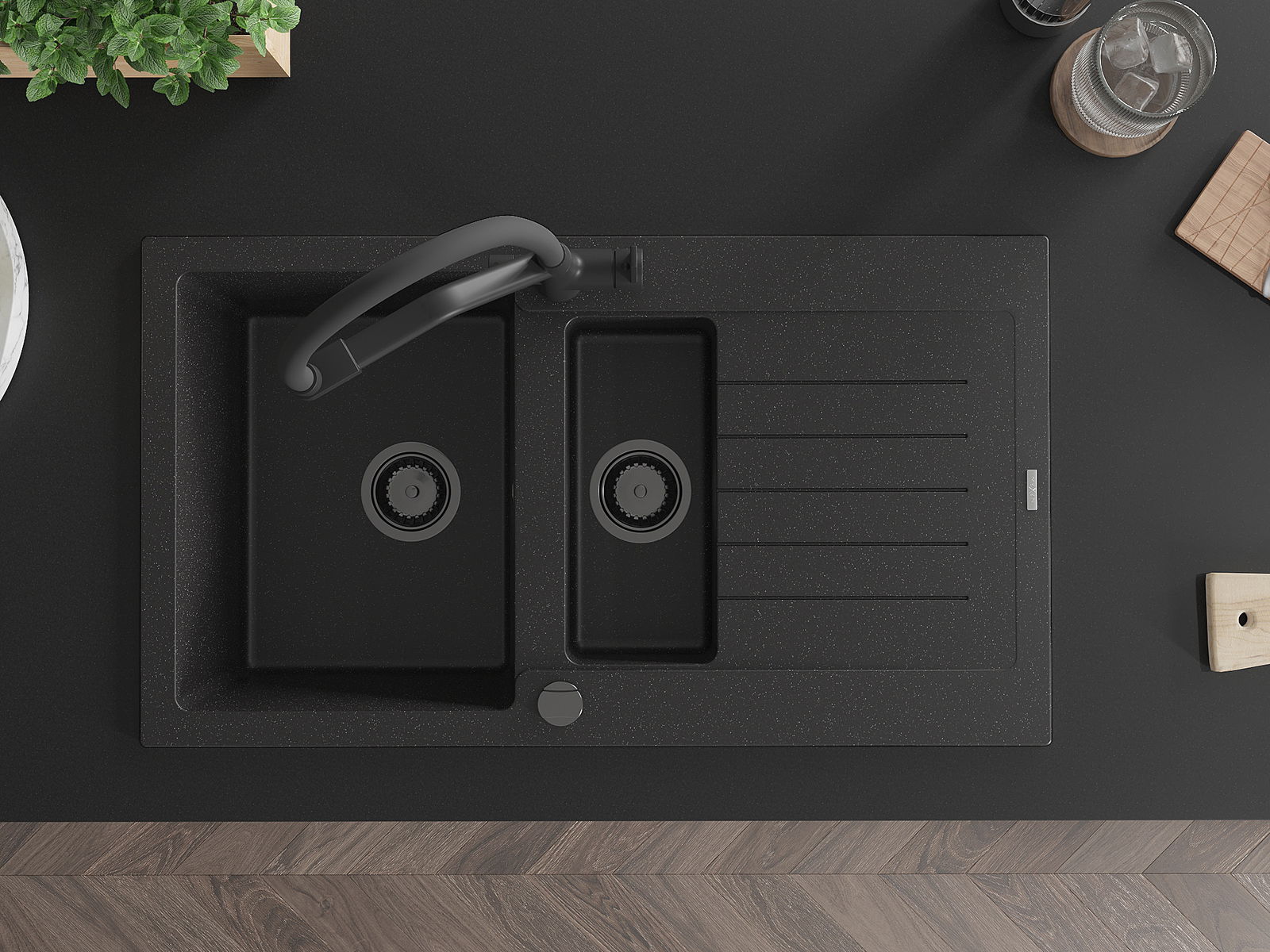 Mexen Matias granitinė 1,5 dubens kriauklė su nusausintuvu ir virtuviniu maišytuvu Duo, juoda/sidabrinė - 6502-73-671701-70-B