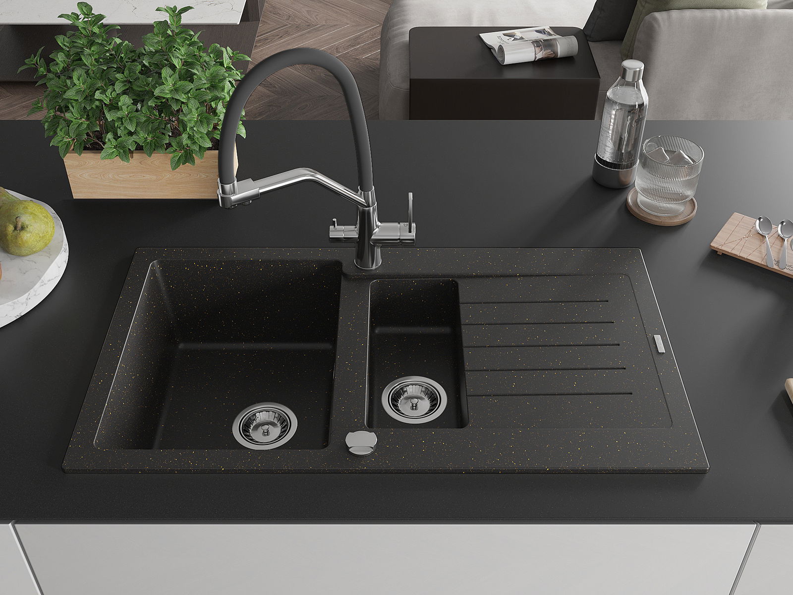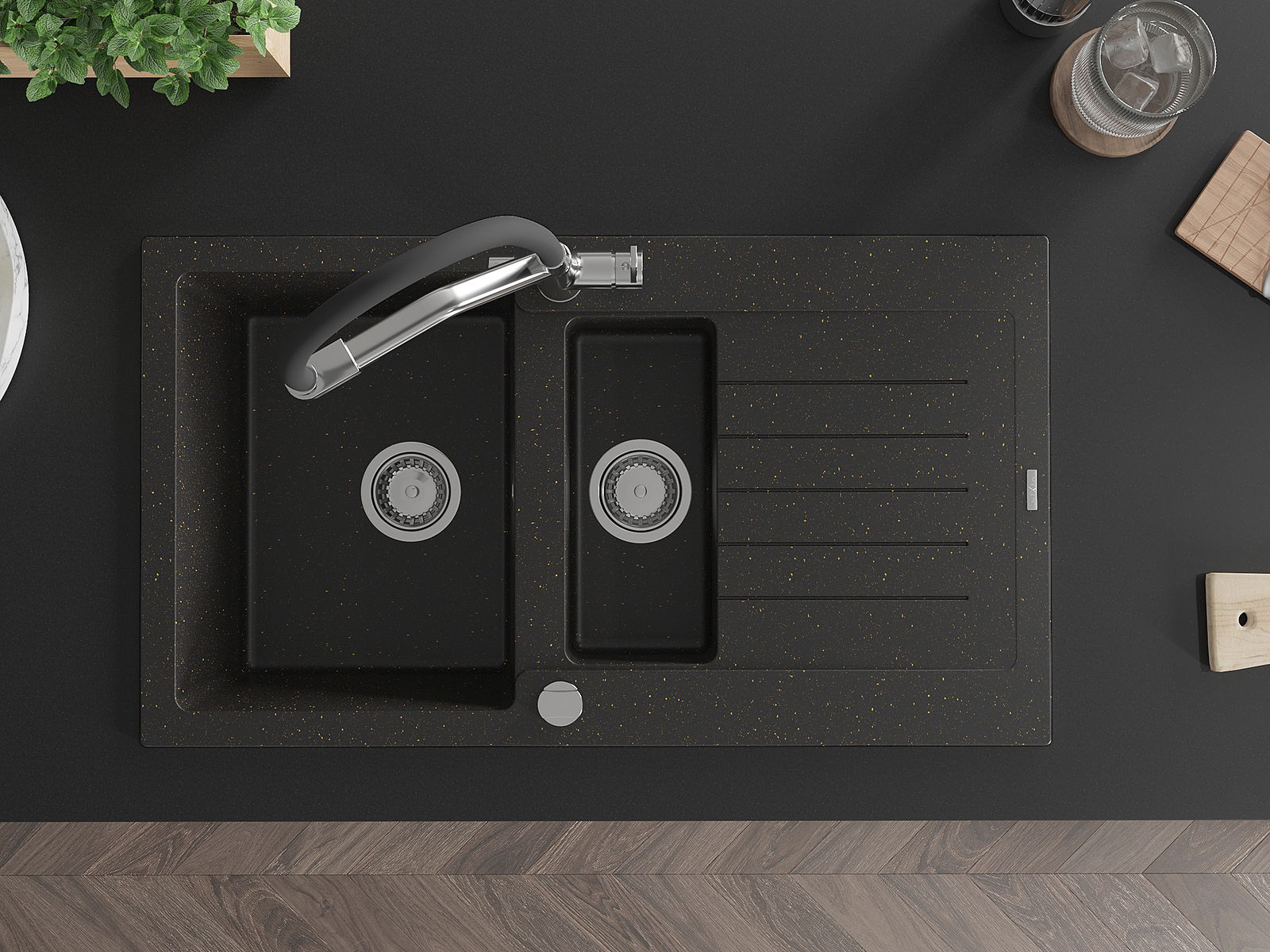 Mexen Matias granitinė 1,5 skylių plautuvė su nusausintuvu ir virtuviniu maišytuvu Duo, juoda/auksinė metalo spalva