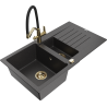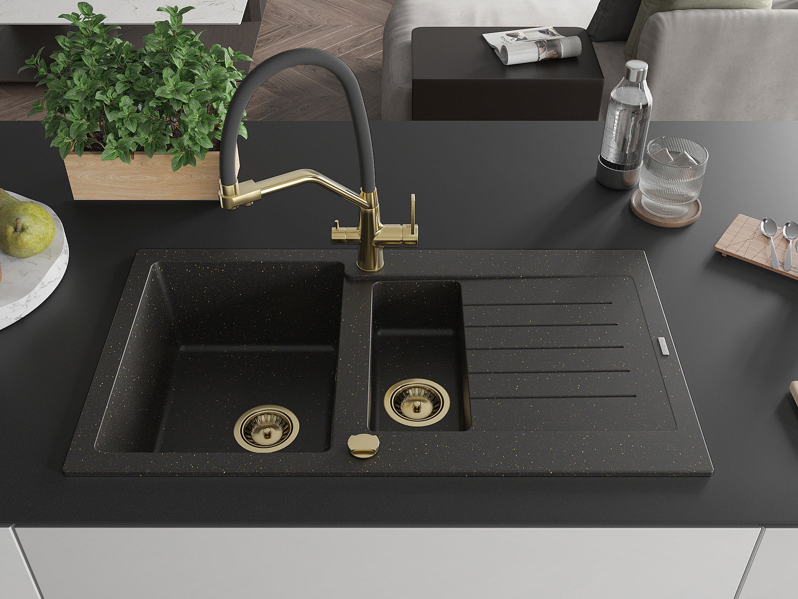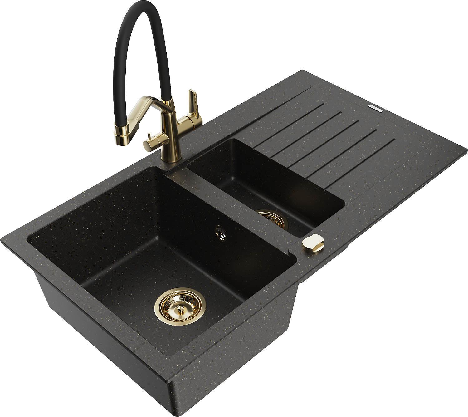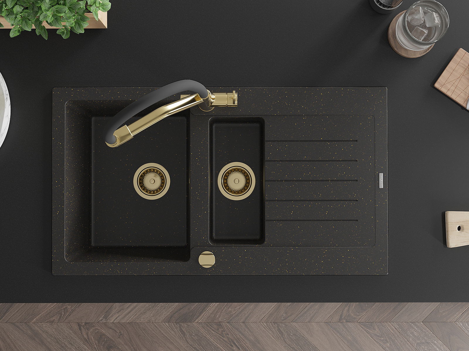 Mexen Matias 1,5 skylių granito plautuvė su nusausintuvu ir Duo virtuviniu maišytuvu, juodas/auksinis metalikas