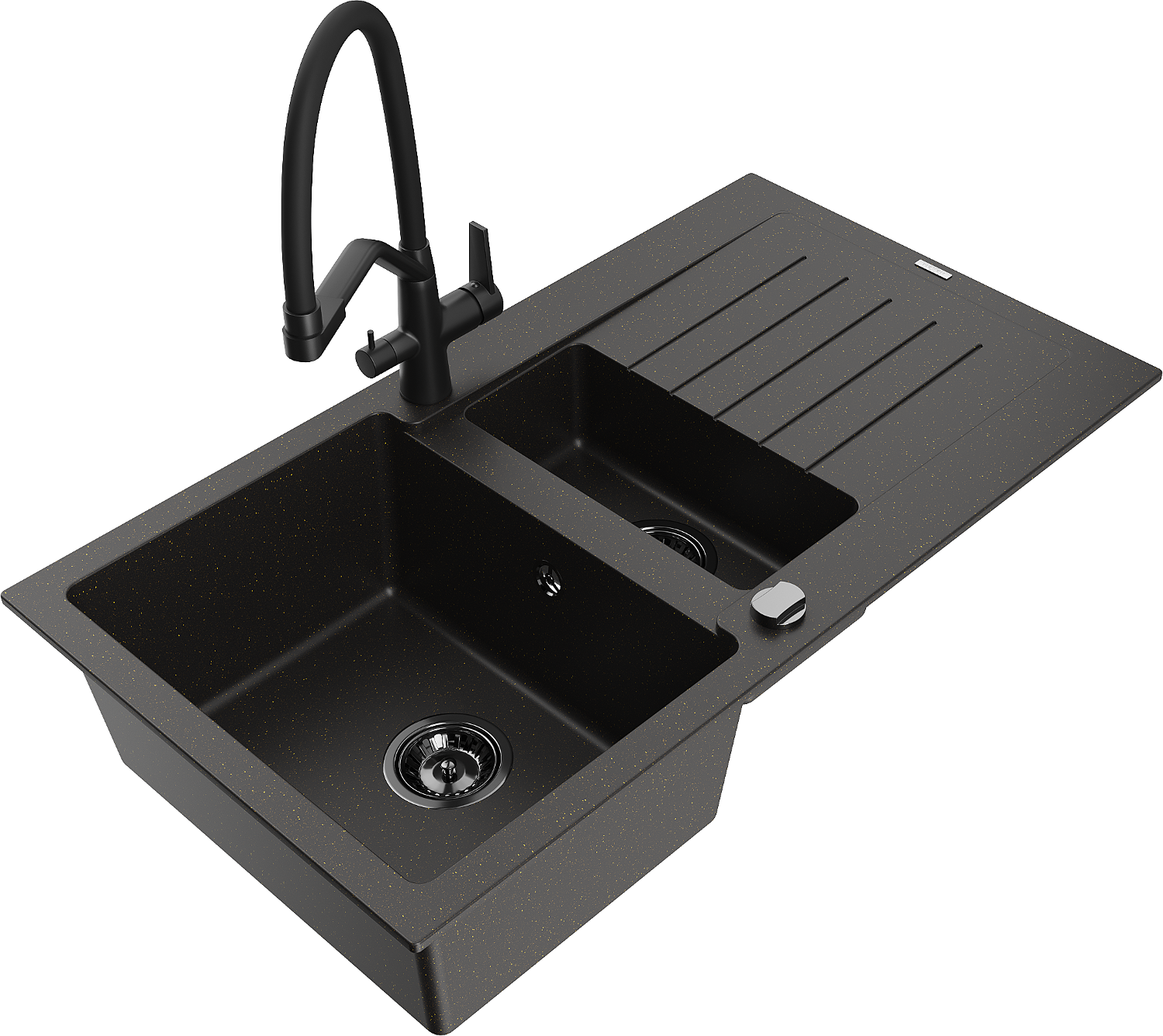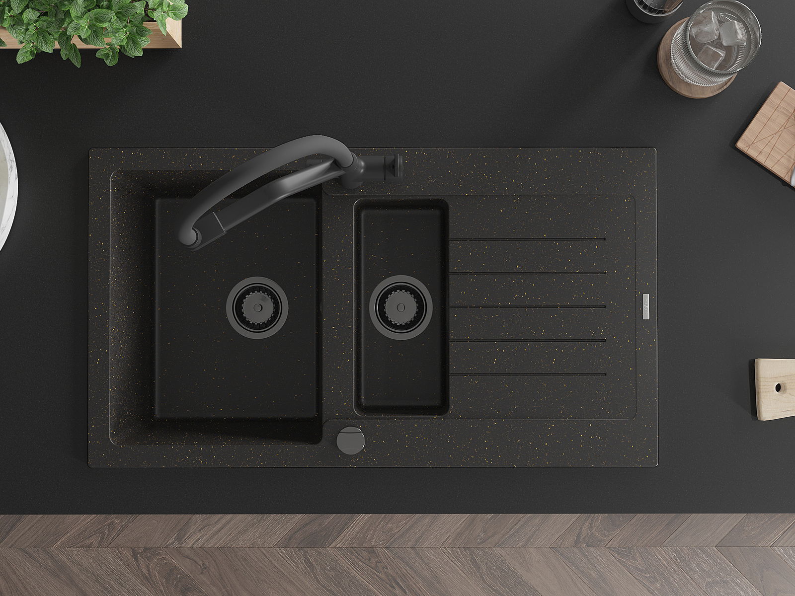 Mexen Matias granitinė 1,5 skylių plautuvė su drenažu ir Duo virtuvės maišytuvu, juoda/aukso metalikas - 6502-75-671701-70-B
