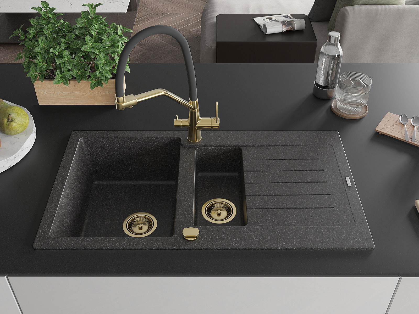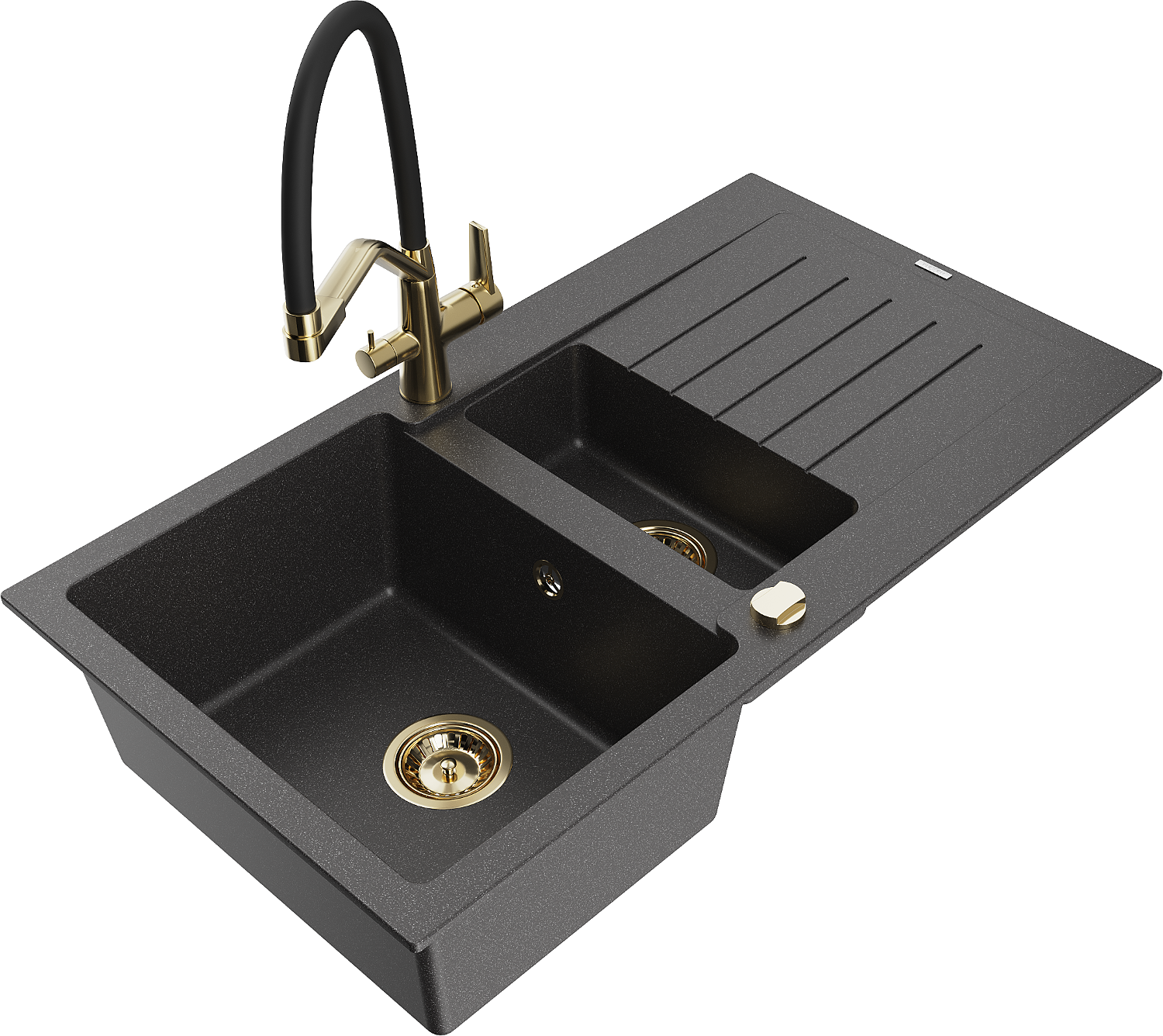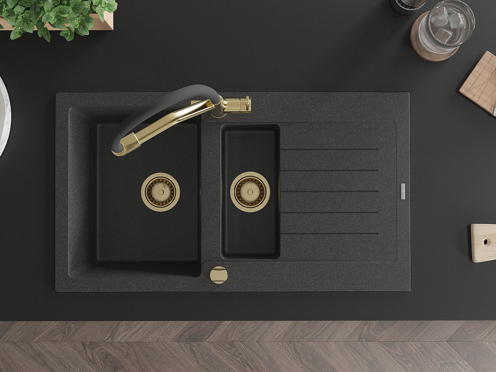 Mexen Matias granito kriauklė su 1,5 skyriaus padėklu ir Duo virtuviniu maišytuvu, juodas su taškeliais - 6502-76-671701-57-G