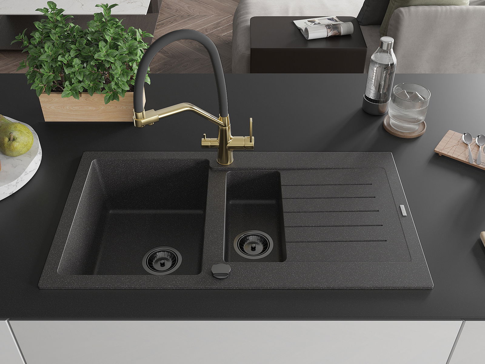 Mexen Matias granitas 1,5 skylių plautuvė su lašintuvu ir virtuvės maišytuvu Duo, juoda dėmėta - 6502-76-671701-57-B