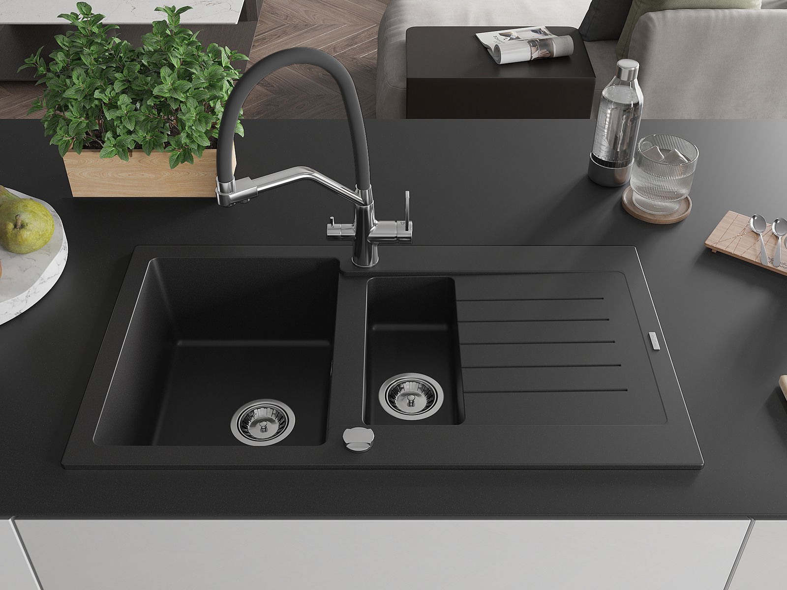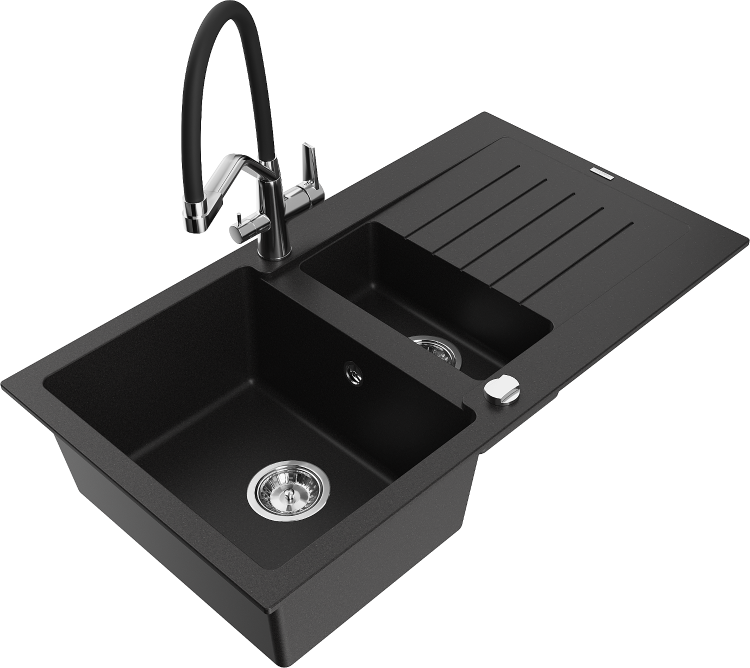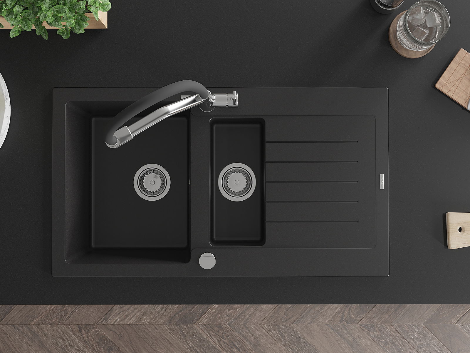 Mexen Matias granitinė 1,5 skydo kriauklė su lašintuvu ir virtuviniu maišytuvu Duo, juoda - 6502-77-671701-07
