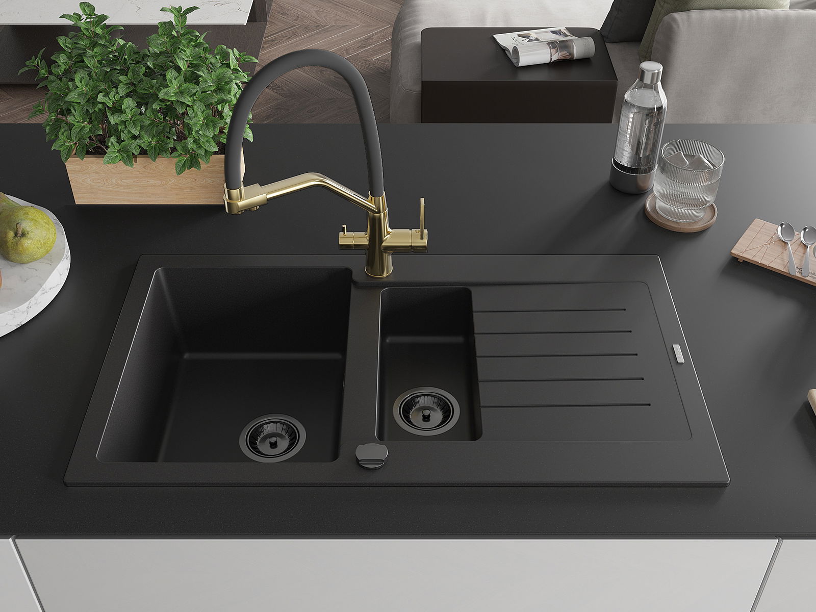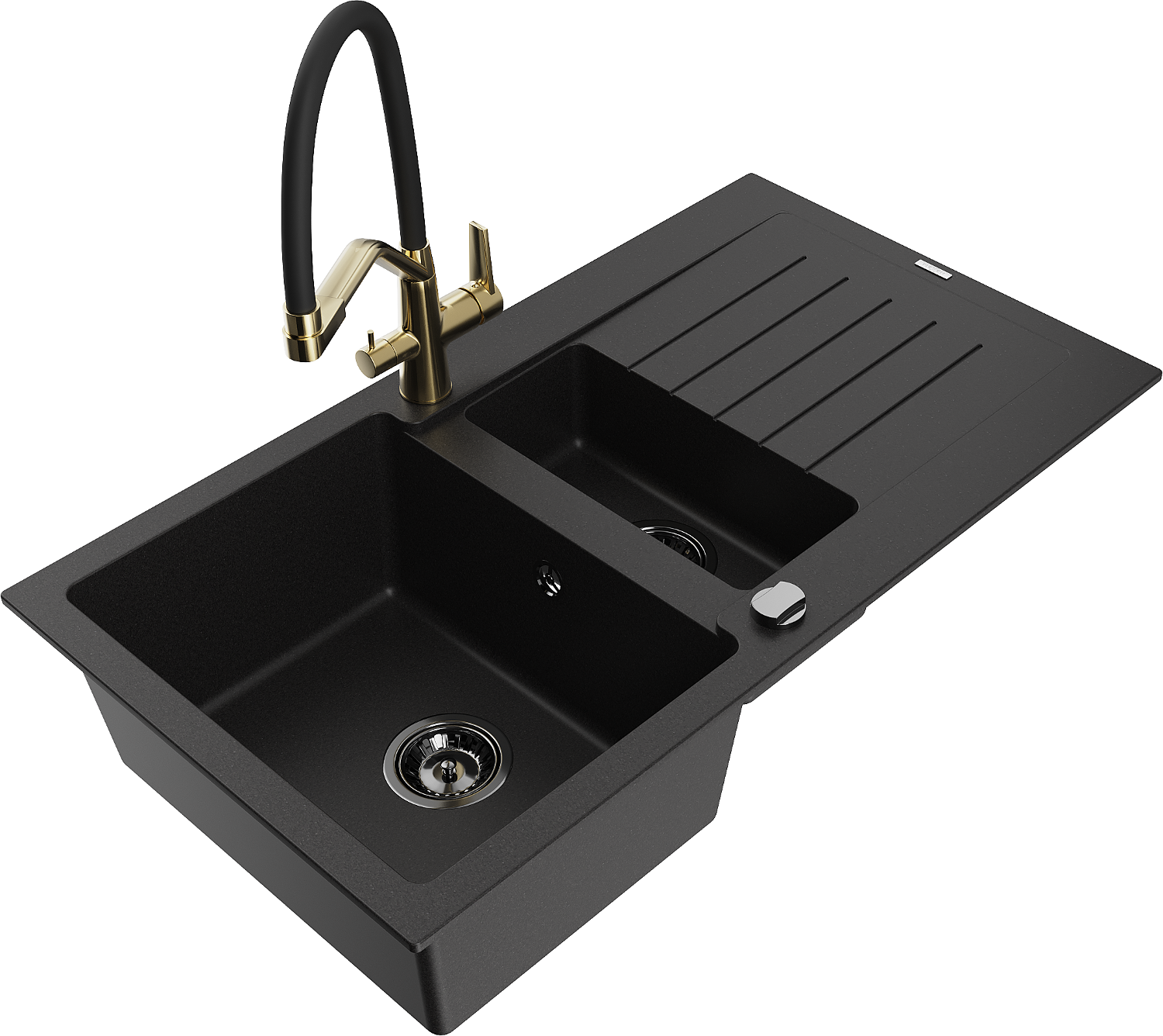 Mexen Matias granitinė 1,5 kamerų plautuvė su džiovykle ir virtuviniu maišytuvu Duo, juodas - 6502-77-671701-57-B