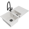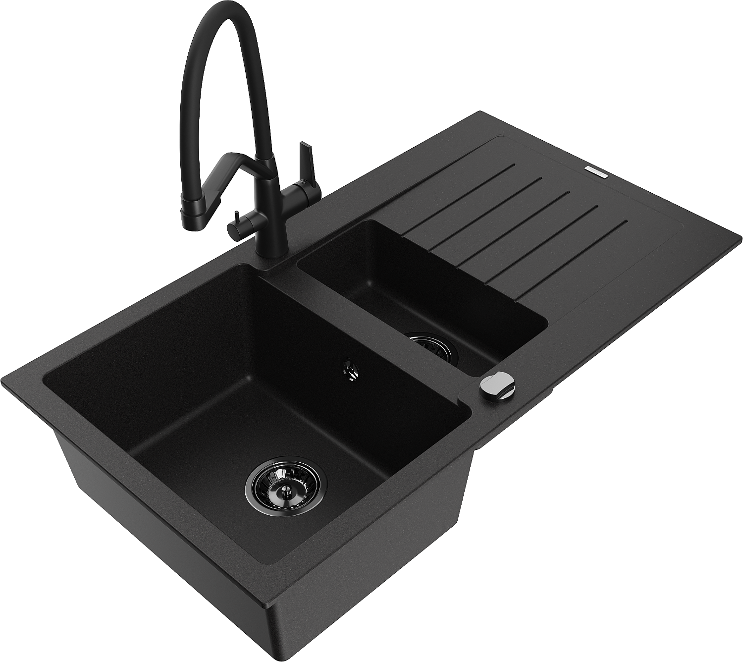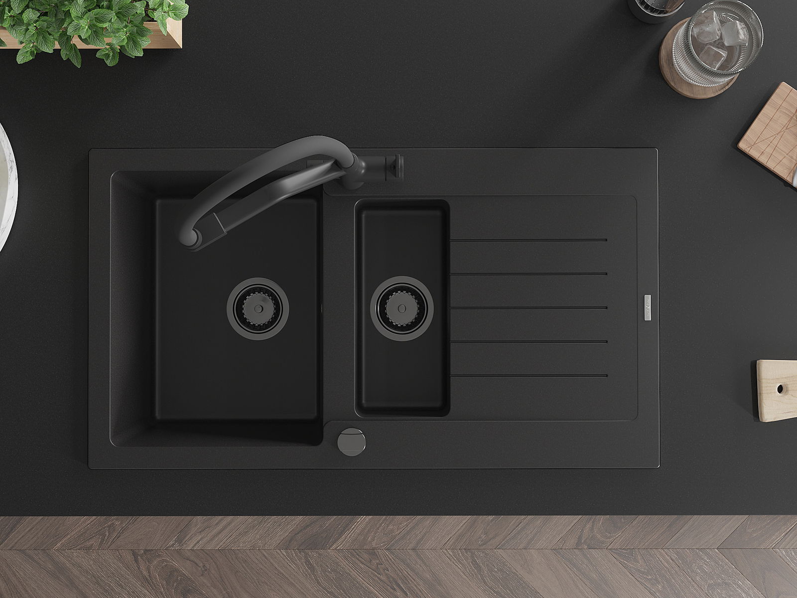 Mexen Matias granitinis 1,5 kamerų plautuvas su nutekamuoju padėklu ir Duo virtuvės maišytuvu, juodas - 6502-77-671701-70-B