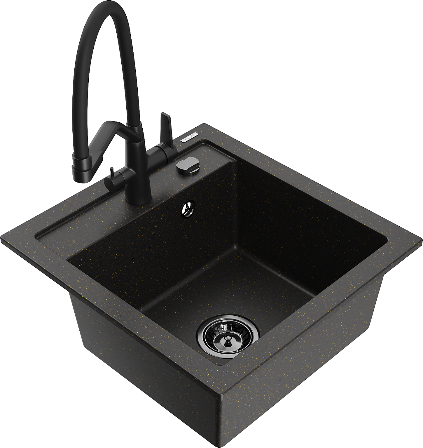 Mexen Vito granitinė vienos plautuvės kriauklė su Duo virtuviniu maišytuvu, juodas/auksinis metalikas - 6503-75-671701-70-B