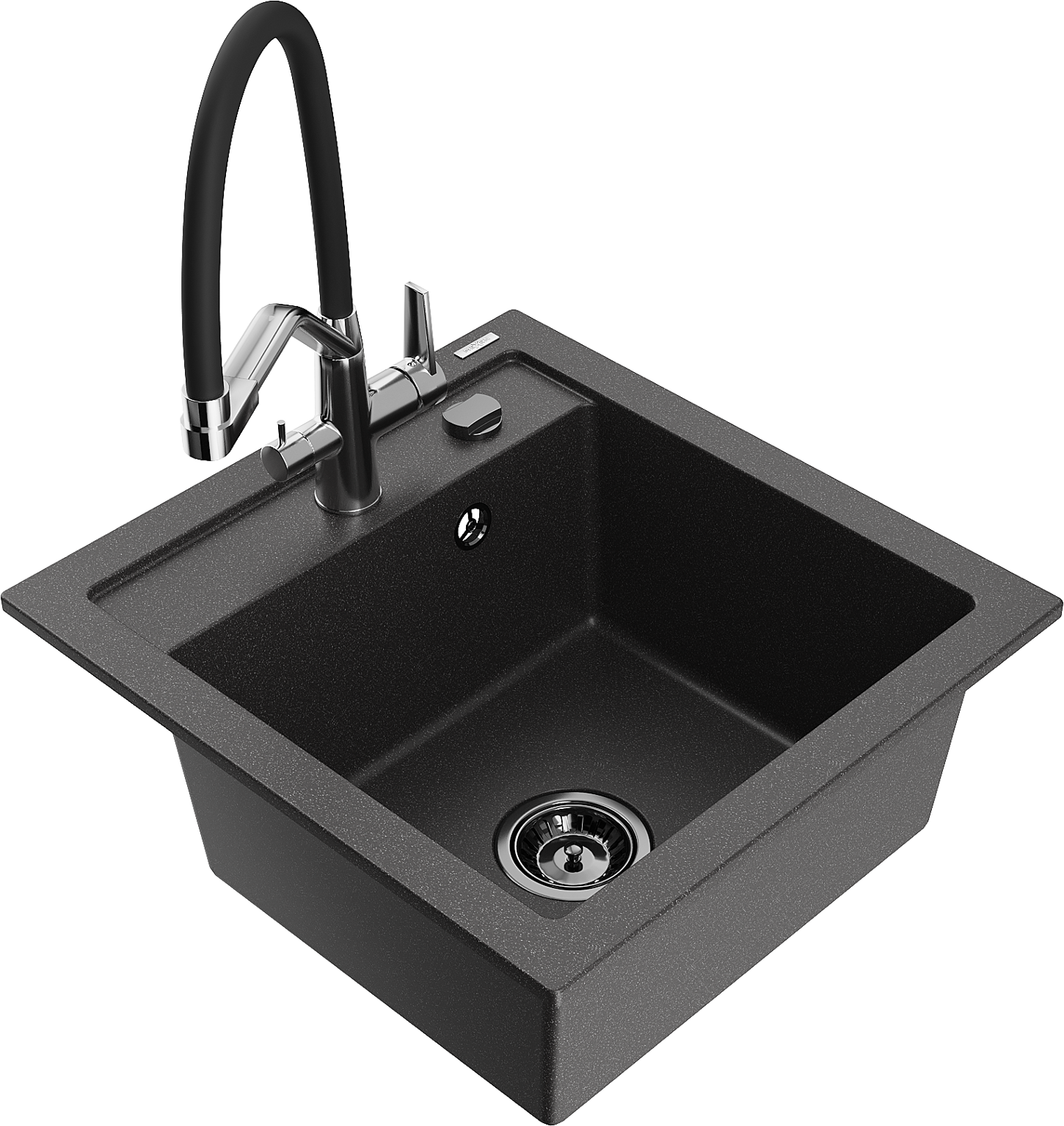 Mexen Vito granitinė vienos kameros virtuvinė plautuvė su Duo maišytuvu, juoda su dėmelėmis - 6503-76-671701-07-B