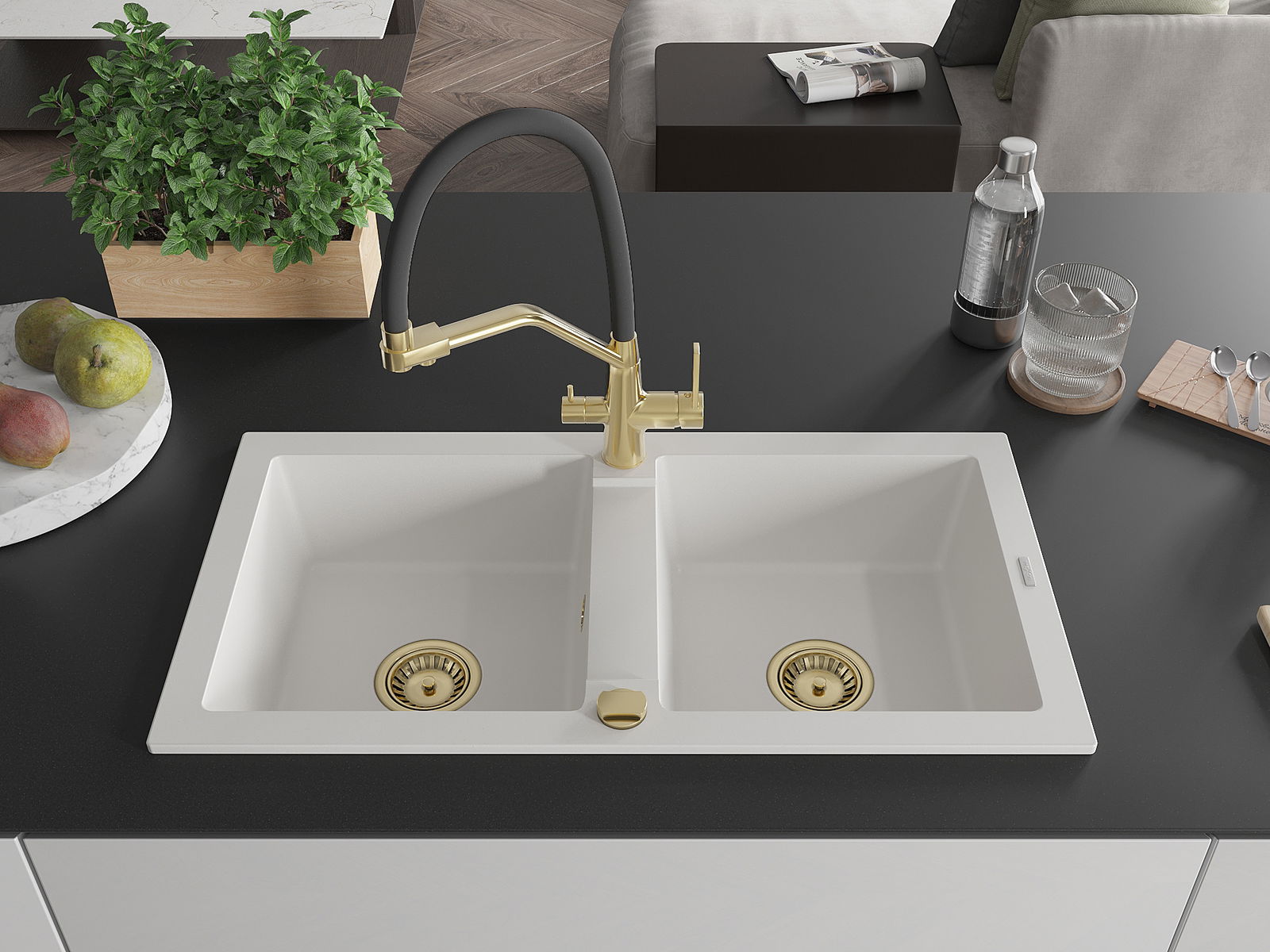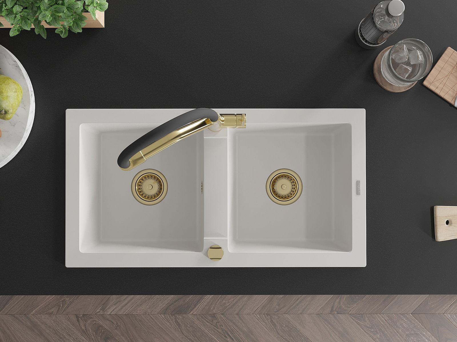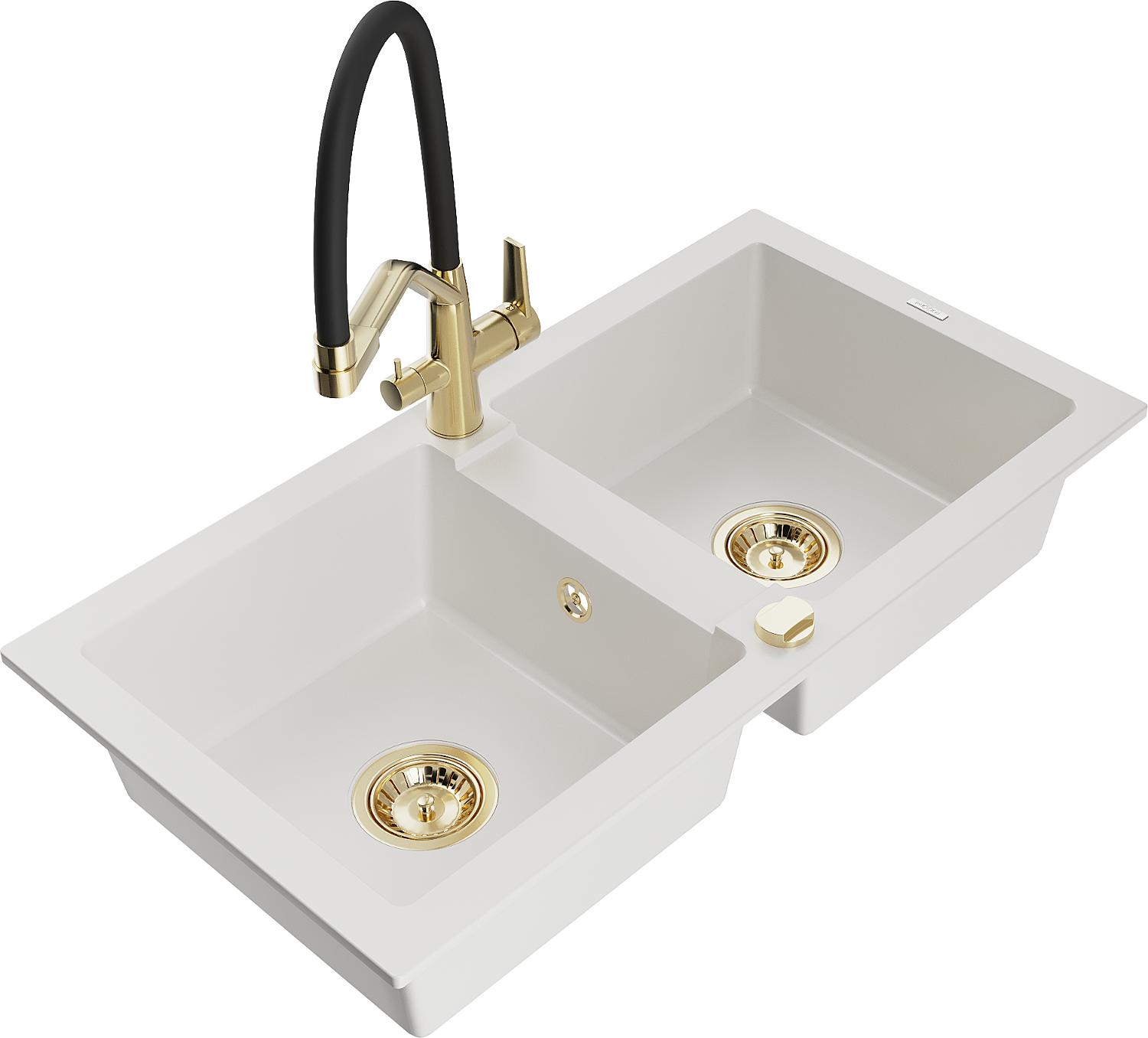 Mexen Mario granitinė dviejų skyrių virtuvės plautuvė su Duo maišytuvu, balta - 6504-20-671701-57-G