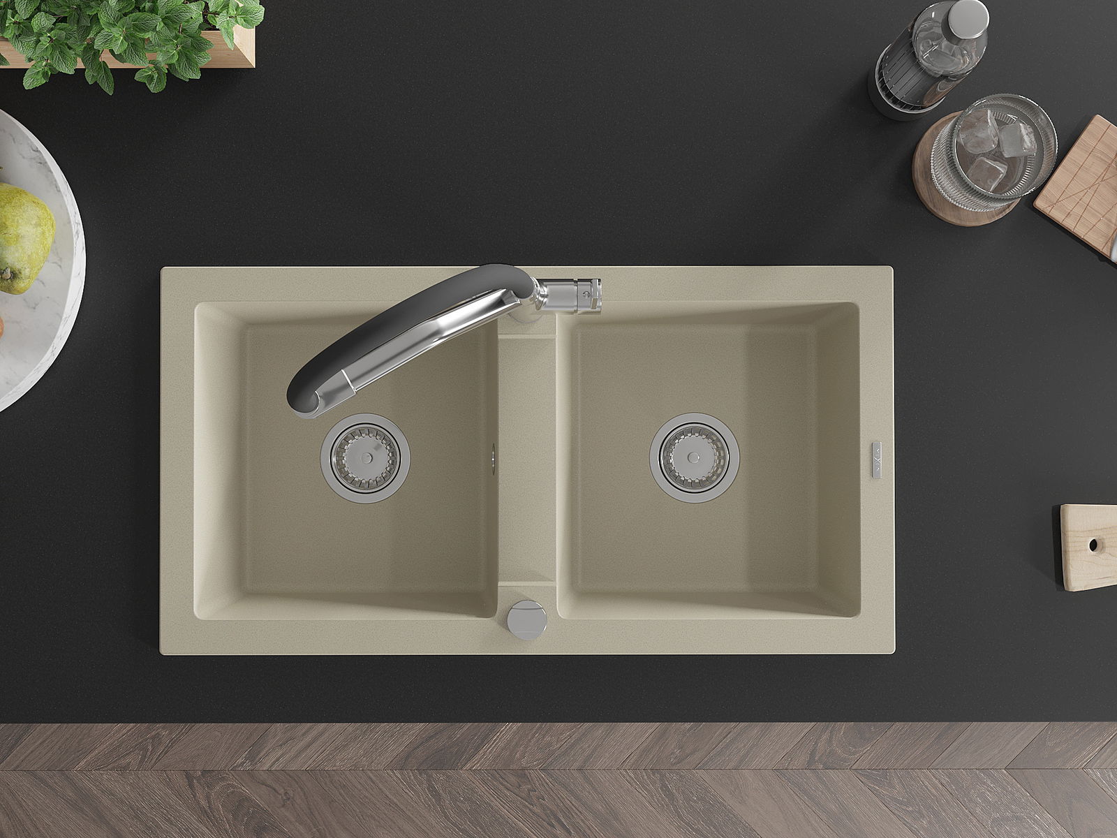 Mexen Mario granitinis dviejų kamerų virtuvės kriauklė su maišytuvu Duo, smėlio spalvos - 6504-69-671701-07