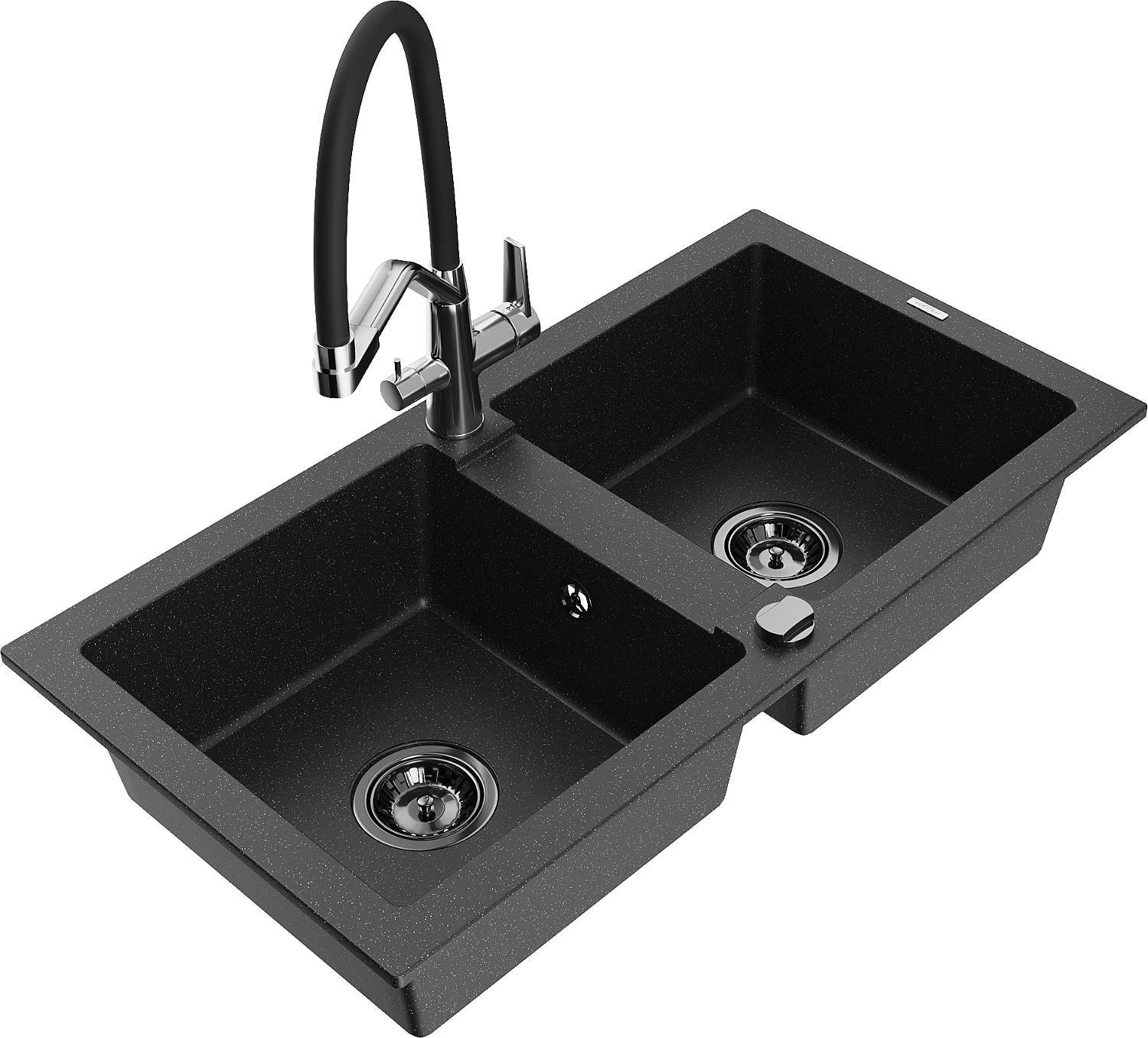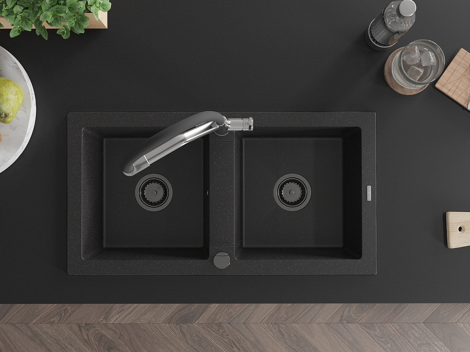 Mexen Mario granitinis dviejų skylių kriauklė su virtuvės maišytuvu Duo, juodas/sidabrinis metalikas - 6504-73-671701-07-B