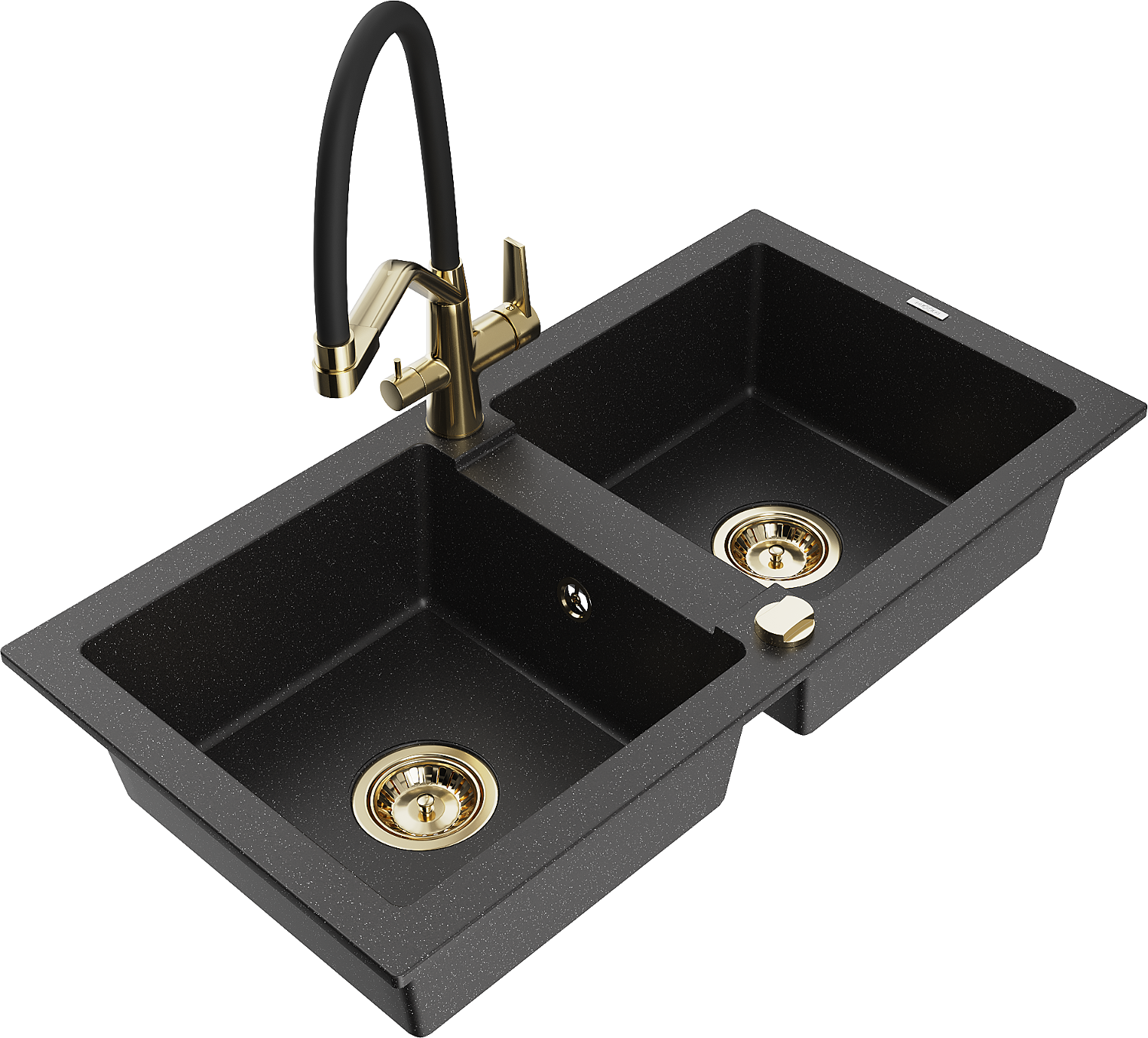 Mexen Mario granitinė dviejų kamerų kriauklė su Duo virtuviniu maišytuvu, juoda/sidabrinė metalinė - 6504-73-671701-57-G