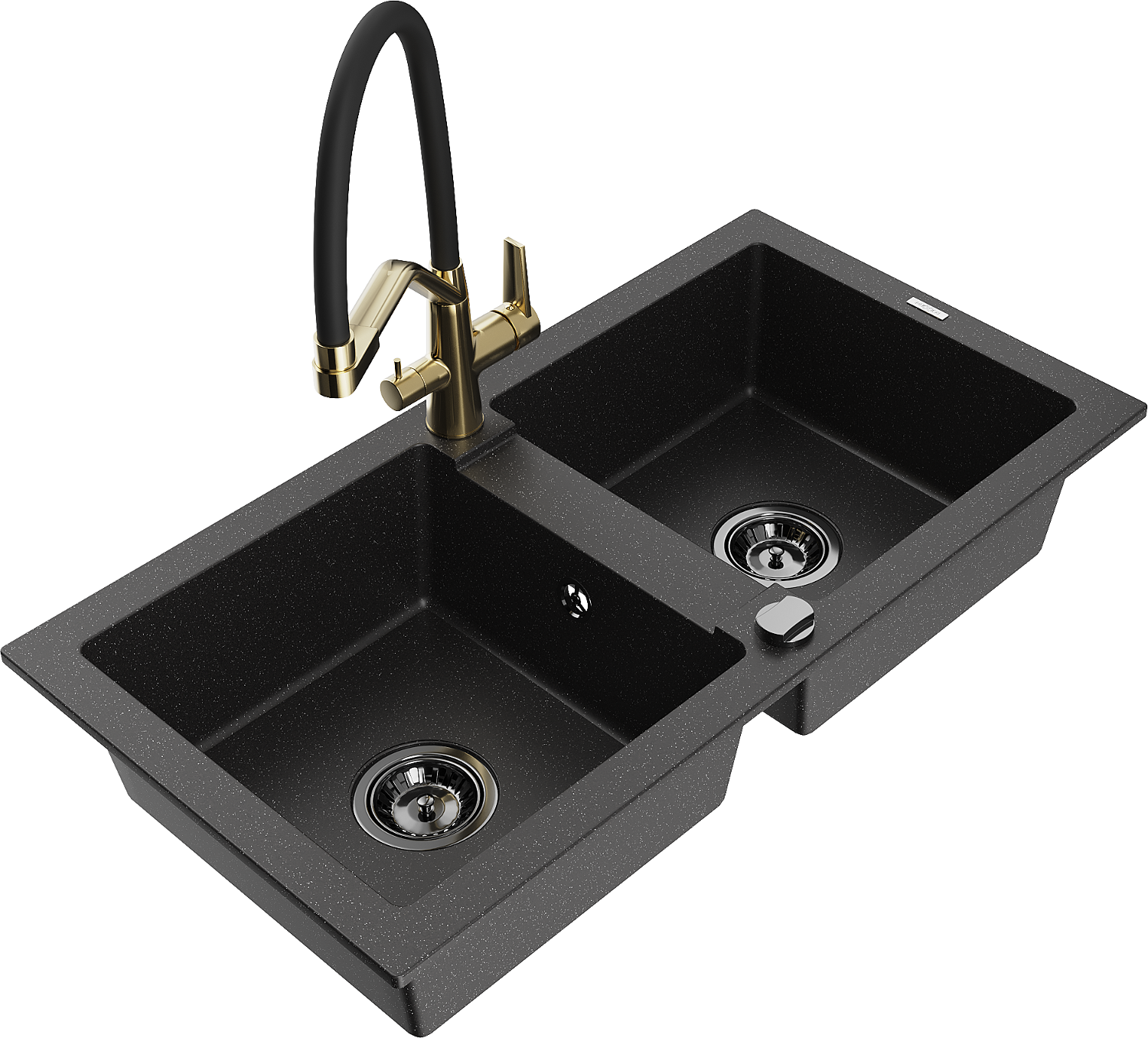 Mexen Mario granito plautuvė, dviejų skyrių, su Duo virtuviniu maišytuvu, juoda/sidabrinis metalikas - 6504-73-671701-57-B