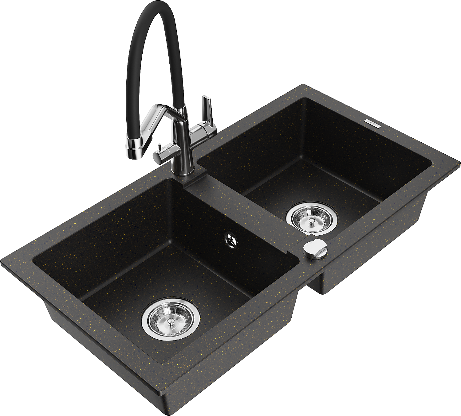Mexen Mario granitinis dviejų skyrių virtuvinis plautuvas su Duo maišytuvu, juodas/auksinis metalikas - 6504-75-671701-07