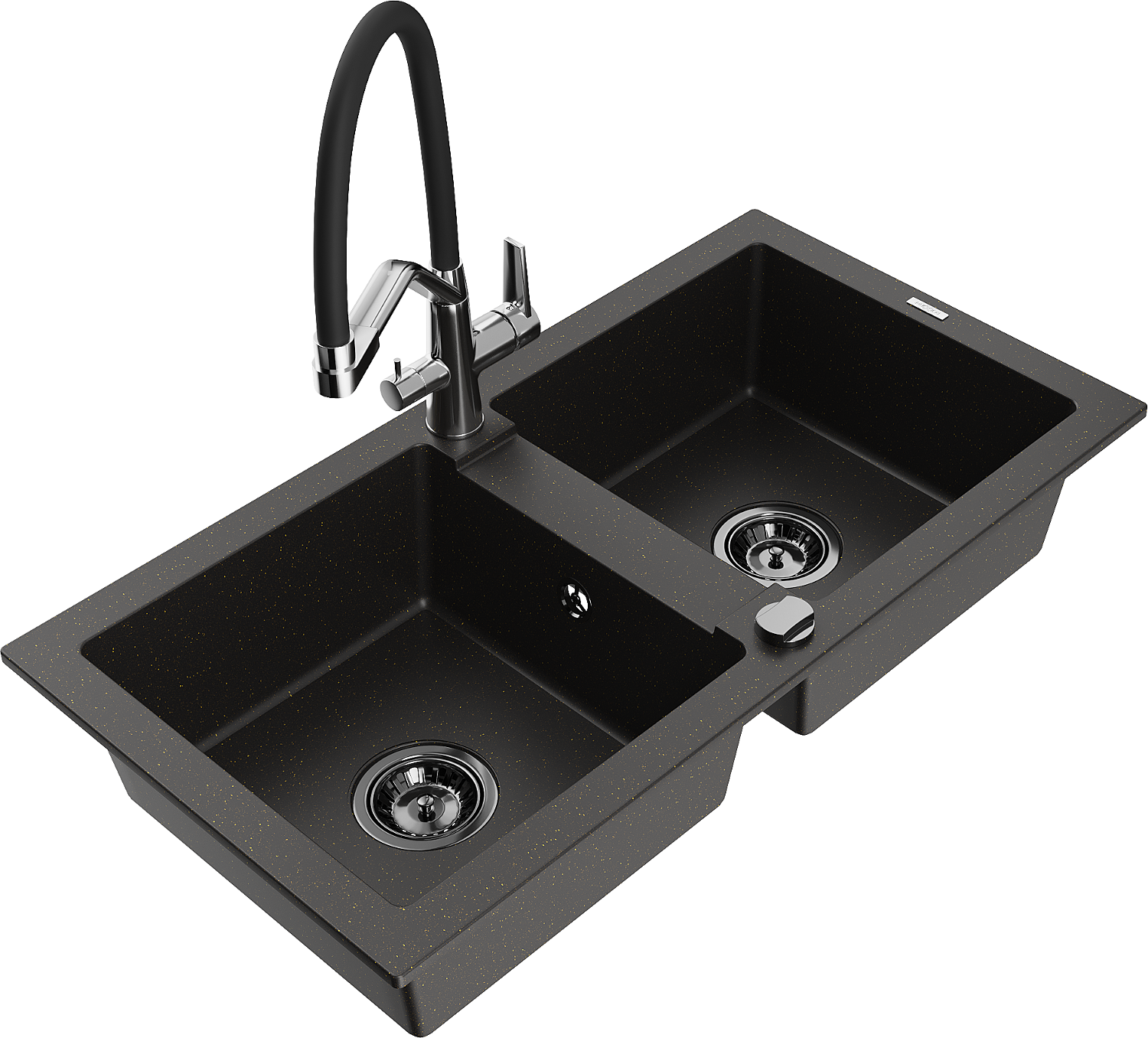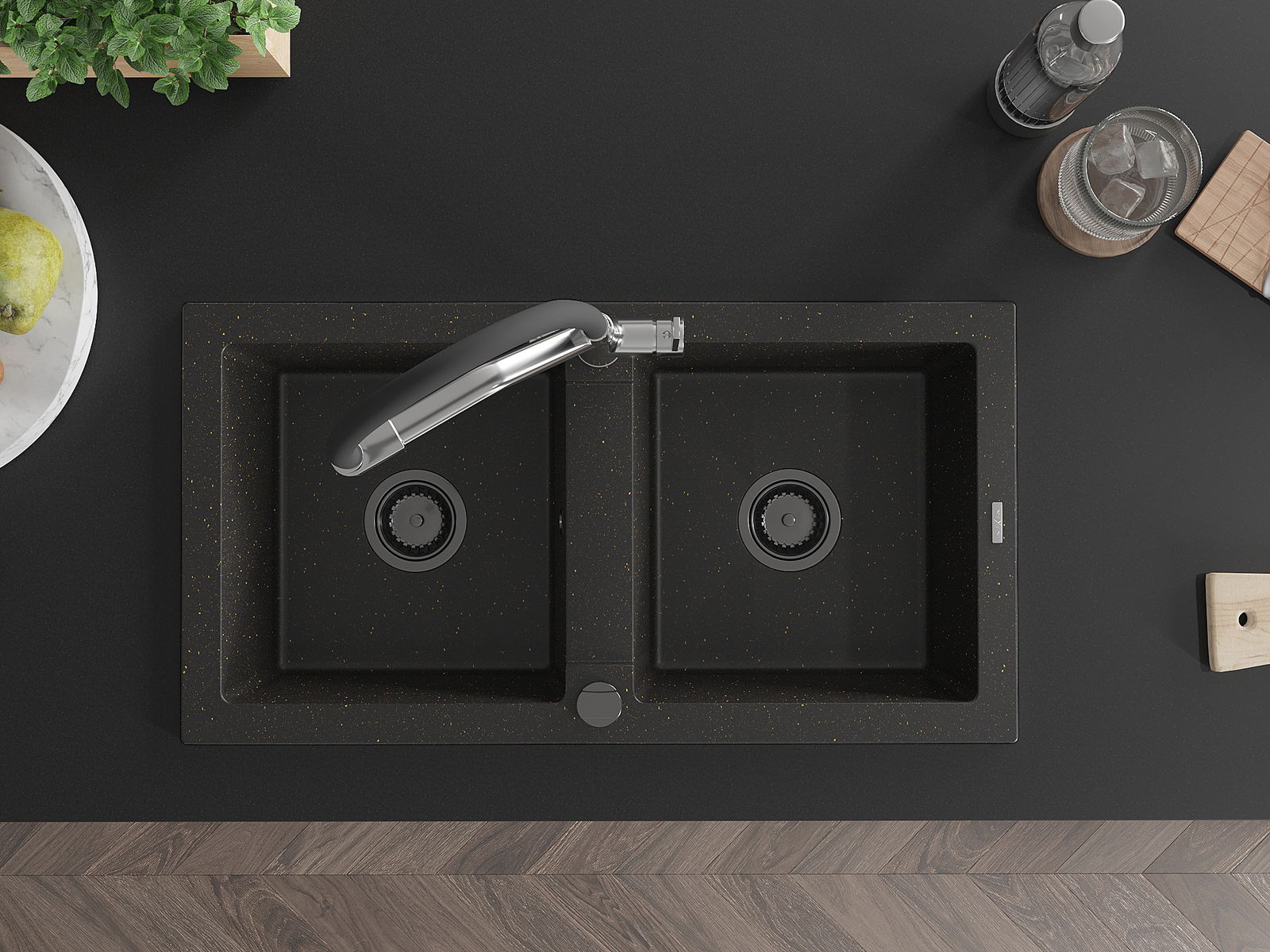 Mexen Mario granito plautuvė 2-jų skyrių su virtuves maišytuvu Duo, juoda/auksinis metalikas - 6504-75-671701-07-B